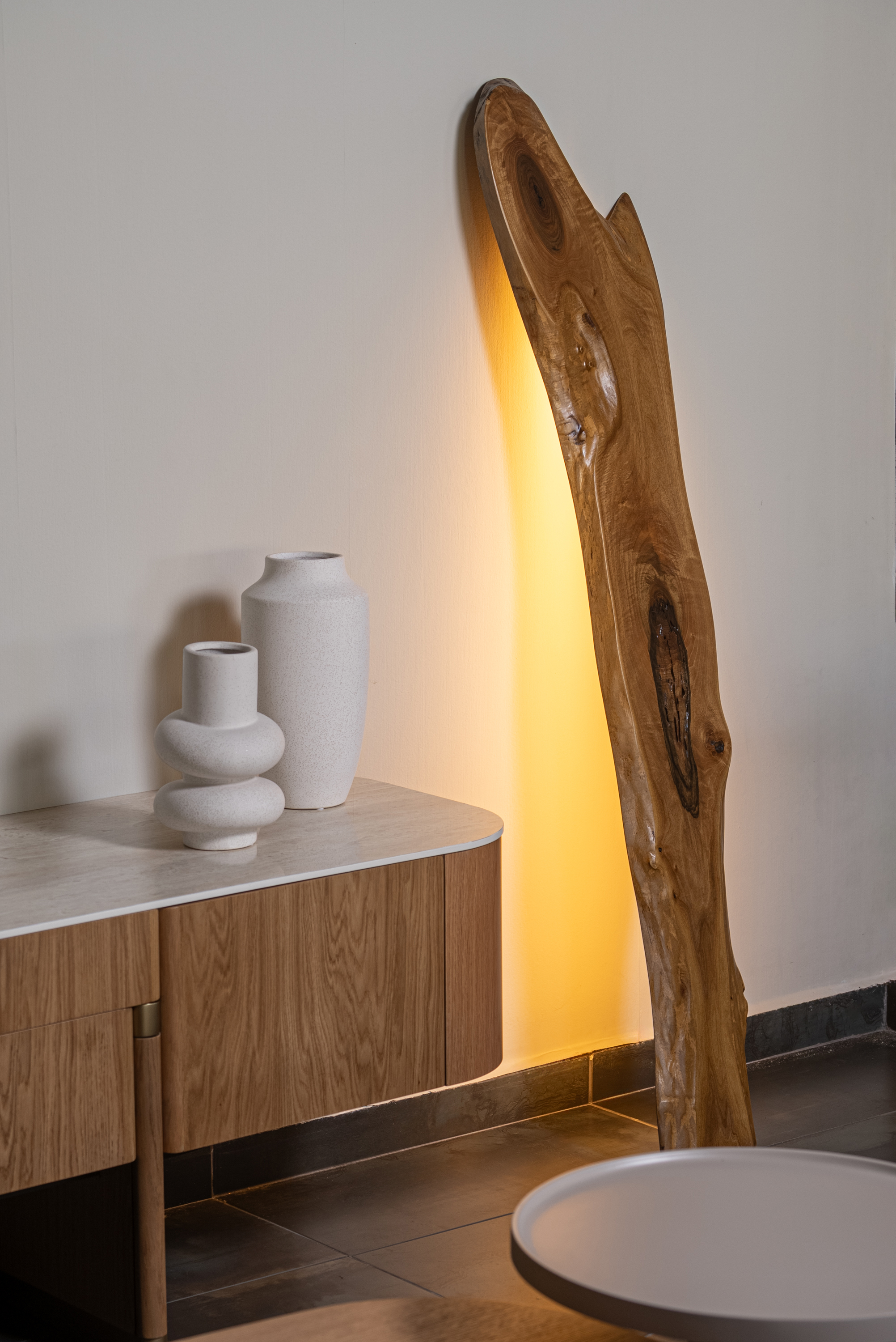 Ο κρυφός φωτισμός στο πίσω μέρος του ξύλου παράγει ζεστό, ατμοσφαιρικό φως που αγκαλιάζει τον χώρο και αναδεικνύει τις φυσικές καμπύλες του κορμού. Το φωτιστικό συνδυάζει τη φυσική αισθητική με σύγχρονη τεχνολογία LED, προσφέροντας χαμηλή κατανάλωση και μεγάλη διάρκεια ζωής.