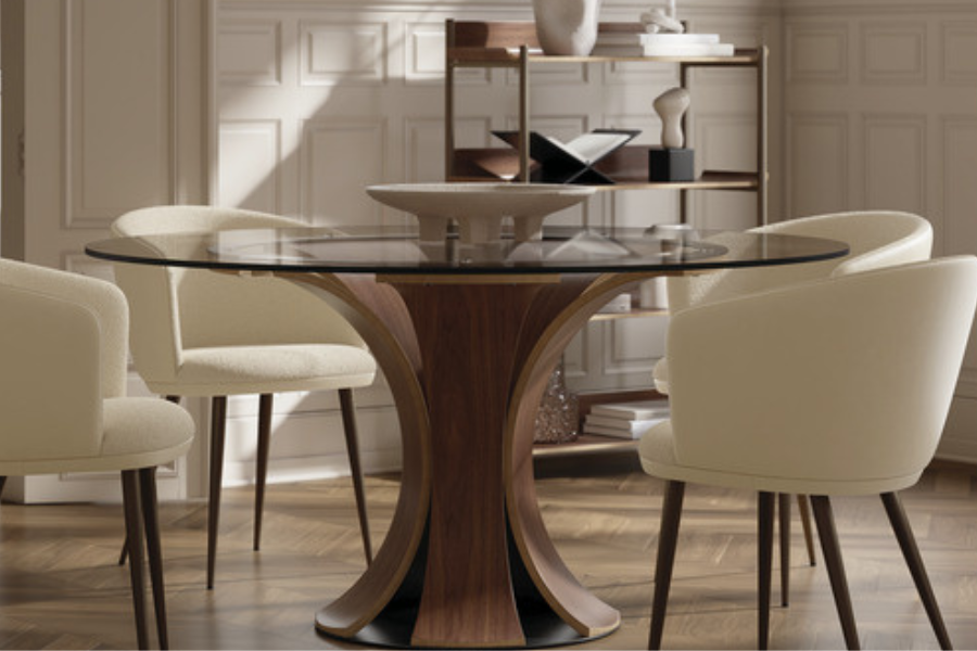 Η στρογγυλή γυάλινη επιφάνειά του προσφέρει κομψότητα και οπτική ελαφρότητα, ενισχύοντας την αίσθηση φωτεινότητας και αρμονίας στην τραπεζαρία.