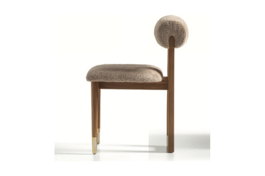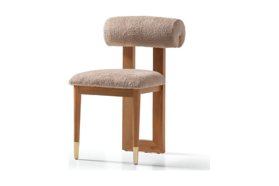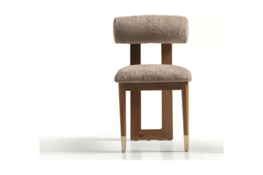Ο ξύλινος σκελετός υψηλής ποιότητας χαρίζει σταθερότητα και αντοχή, ενώ το κάθισμα και η πλάτη με επένδυση bouclé προσθέτουν ζεστασιά και πολυτέλεια στον χώρο.