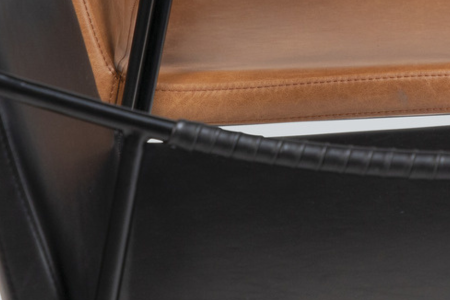 Το κάθισμα και η πλάτη διαθέτουν μαλακή επένδυση με τεχνητό δέρμα σε απόχρωση Vintage Black, προσφέροντας άνεση και κομψότητα στον χώρο της τραπεζαρίας. Η απαλή υφή και η ελαφρώς vintage αισθητική του υλικού δημιουργούν ένα εκλεπτυσμένο αποτέλεσμα που ταιριάζει ιδανικά σε μοντέρνα αλλά και industrial interiors.