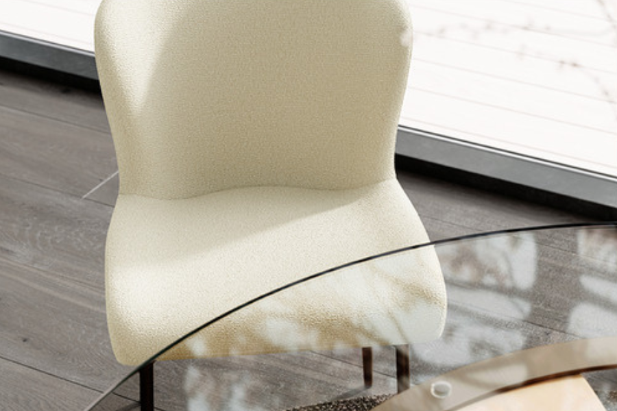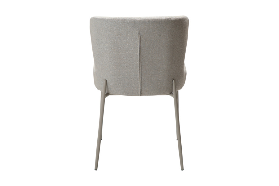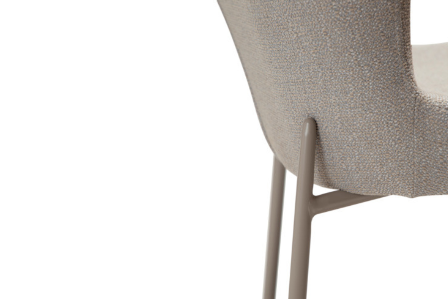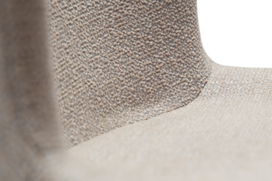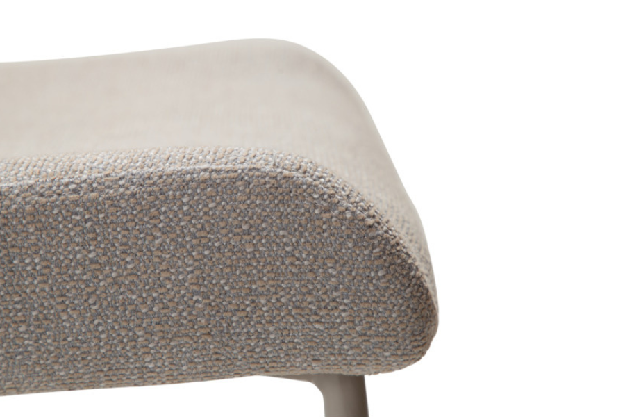 Η επένδυση από bouclé ύφασμα σε cashmere τόνο προσφέρει πλούσια υφή και απαλή αίσθηση, δημιουργώντας μία ζεστή και κομψή ατμόσφαιρα. Ο tonal σχεδιασμός, όπου κάθισμα και πόδια έχουν την ίδια απόχρωση, ενισχύει την αίσθηση καθαρότητας και πολυτέλειας.