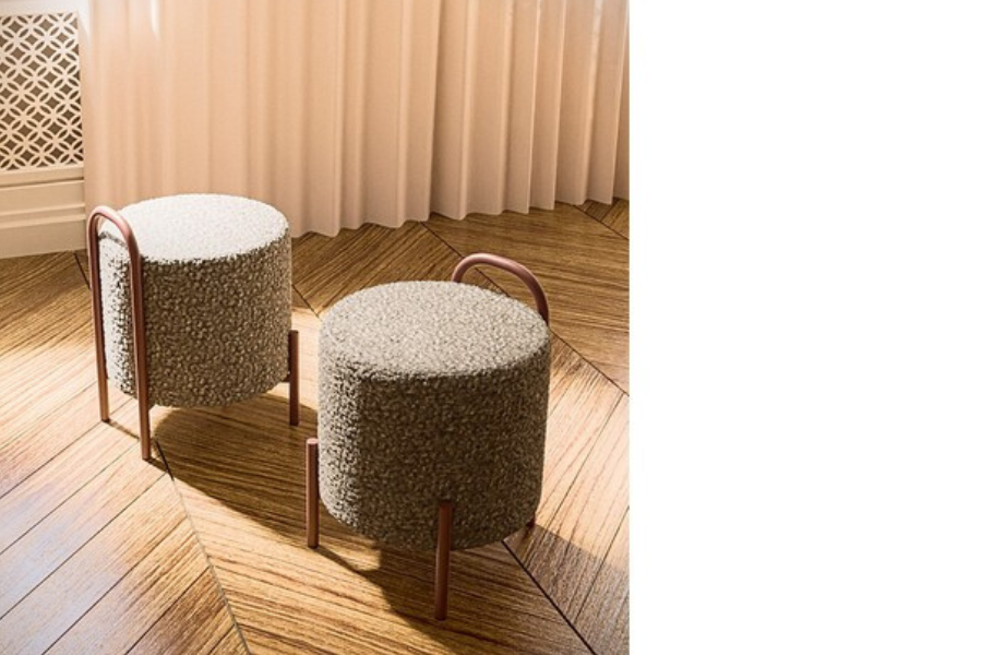 Η κυλινδρική του μορφή με υφασμάτινη επένδυση προσφέρει άνετο κάθισμα, ενώ η ενσωματωμένη μεταλλική λαβή επιτρέπει εύκολη μετακίνηση στον χώρο.