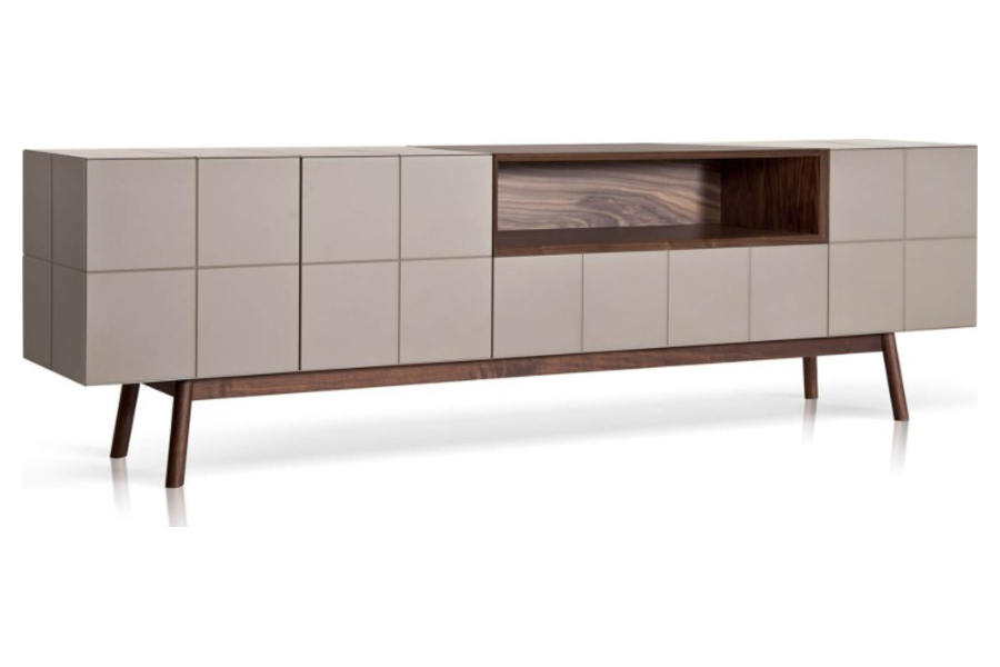 Το κεντρικό ανοιχτό τμήμα σε φυσικό ξύλο προσθέτει αντίθεση και ζεστασιά ενώ ταυτόχρονα λειτουργεί ως πρακτικός αποθηκευτικός ή διακοσμητικός χώρος. Η βάση με λεπτά ξύλινα πόδια προσδίδει ελαφρότητα και κομψότητα στο σύνολο.