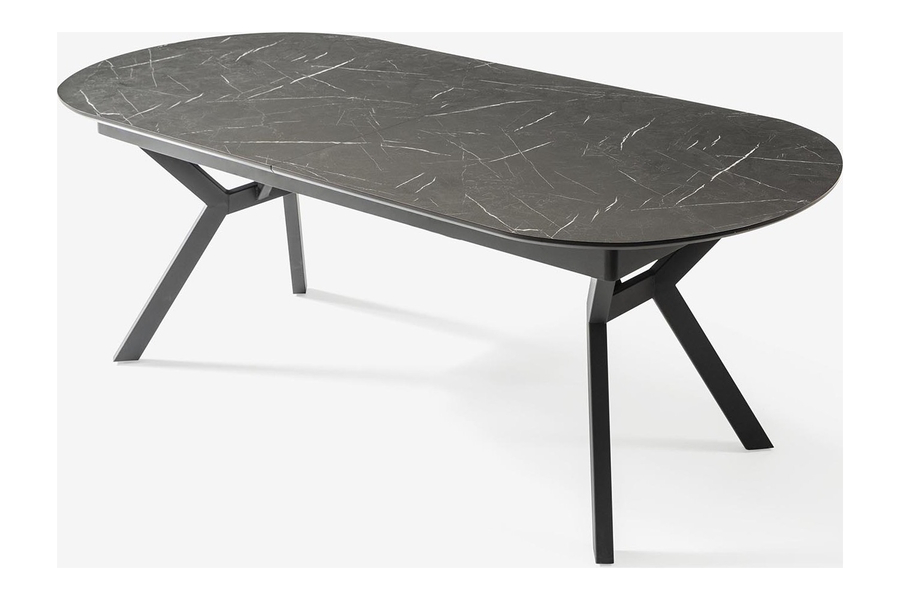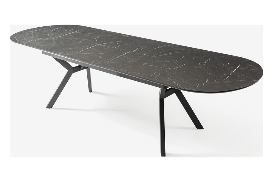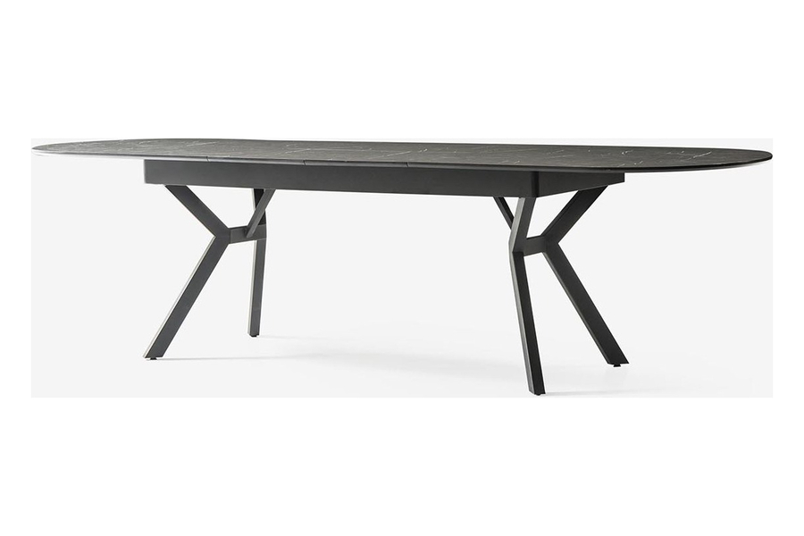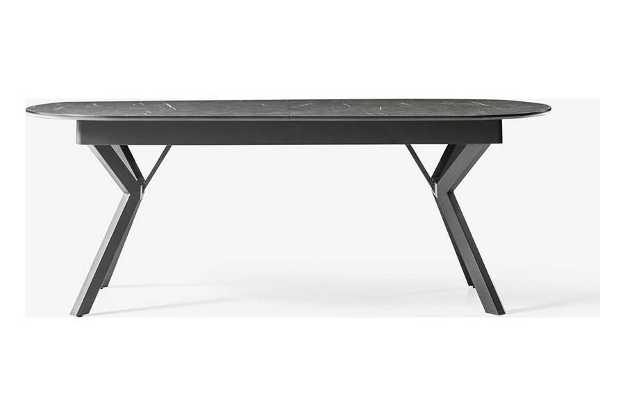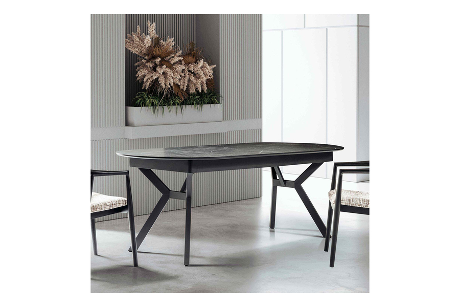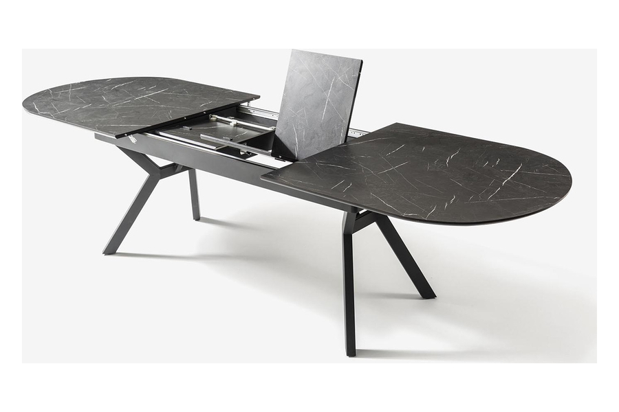 Η μεταλλική βάση του σε απόχρωση μαύρου γραφίτη με γεωμετρικό σχεδιασμό εξασφαλίζει σταθερότητα και μοντέρνα αισθητική, συνδυάζοντας άψογα την αντοχή με το στυλ. Ο μηχανισμός προέκτασης ενσωματώνεται κάτω από την επιφάνεια, επιτρέποντας εύκολη επέκταση για μεγαλύτερη χωρητικότητα.