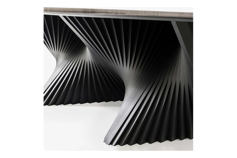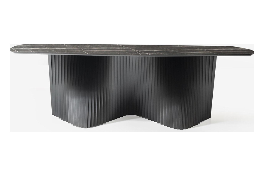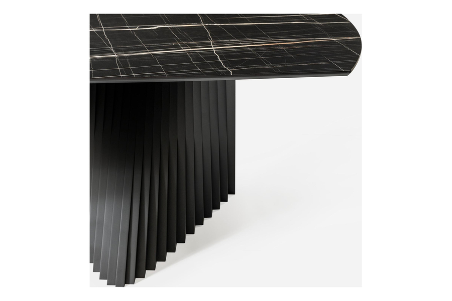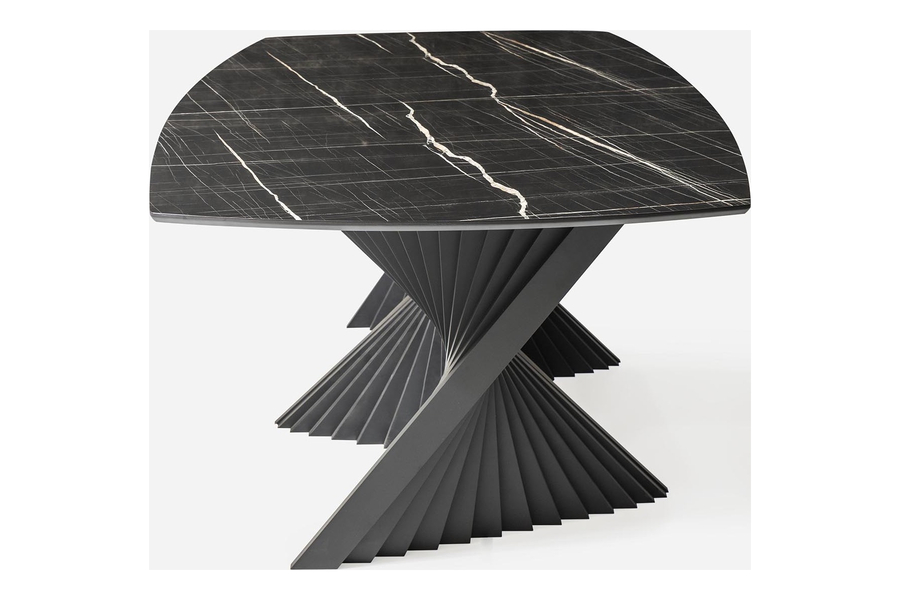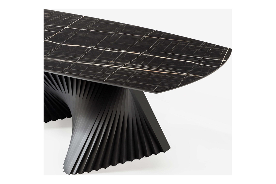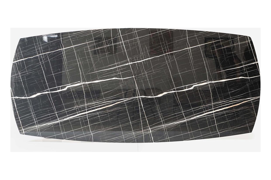 Το τραπέζι τραπεζαρίας Boss αποτελεί ένα αριστούργημα σύγχρονου σχεδιασμού που συνδυάζει την πολυτέλεια με τη γεωμετρική αρμονία. Η επιφάνειά του είναι κατασκευασμένη από HPL (High Pressure Laminate) υψηλής αντοχής σε απόχρωση μαύρου μαρμάρου με διακριτικές λευκές φλέβες, προσφέροντας κομψότητα και εξαιρετική ανθεκτικότητα.