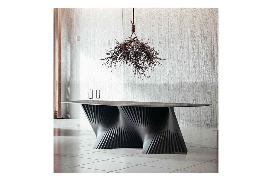Η διπλή του μεταλλική βάση με γλυπτική μορφή σε σχήμα έλικας δημιουργεί ένα μοναδικό οπτικό αποτέλεσμα που θυμίζει έργο τέχνης. Το Boss αποτελεί ιδανική επιλογή για χώρους που επιζητούν δυναμικό design και υψηλή αισθητική.