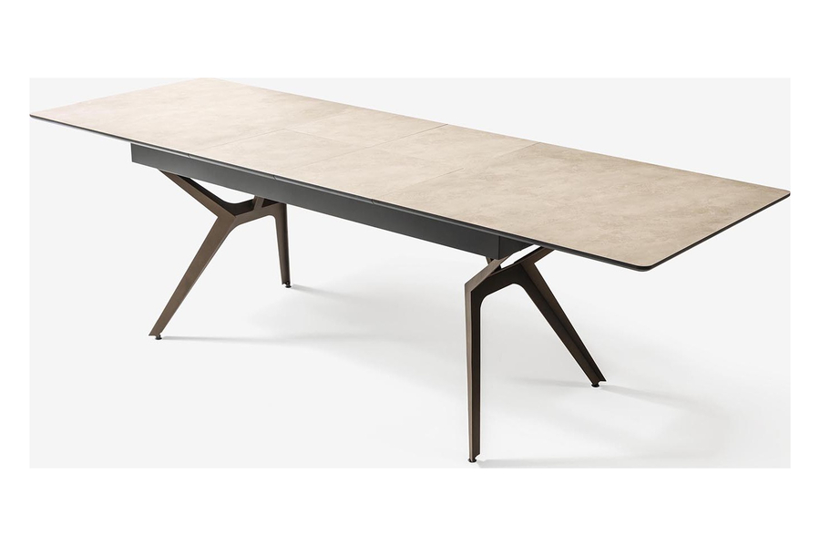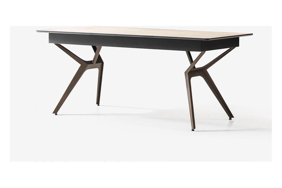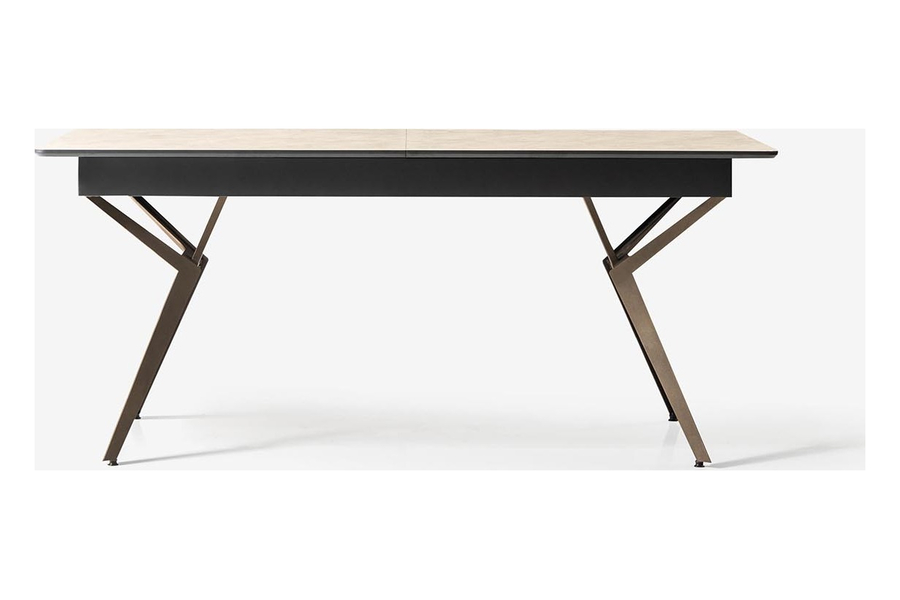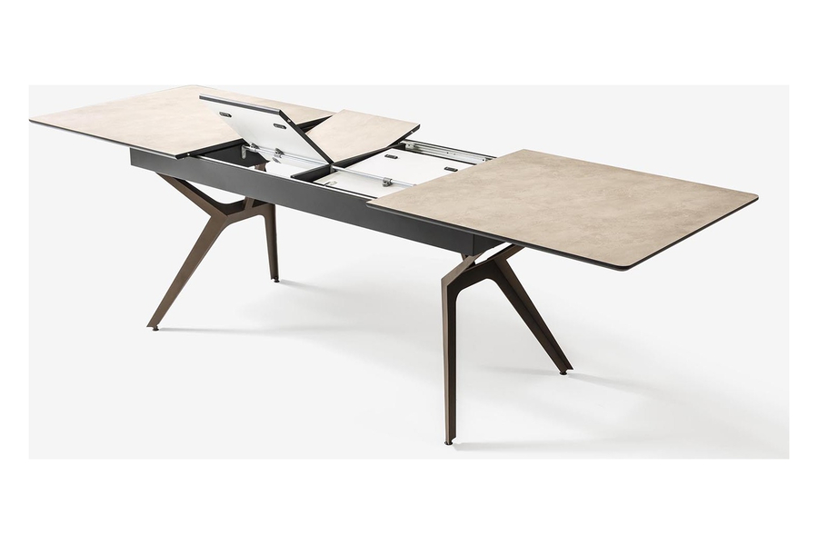 Η μεταλλική του βάση σε γεωμετρικό σχεδιασμό με bronze φινίρισμα προσδίδει κομψότητα και δυναμισμό, δημιουργώντας ένα εντυπωσιακό οπτικό αποτέλεσμα. Ο μηχανισμός προέκτασης ενσωματώνεται διακριτικά κάτω από την επιφάνεια και επιτρέπει την εύκολη επέκταση του τραπεζιού.