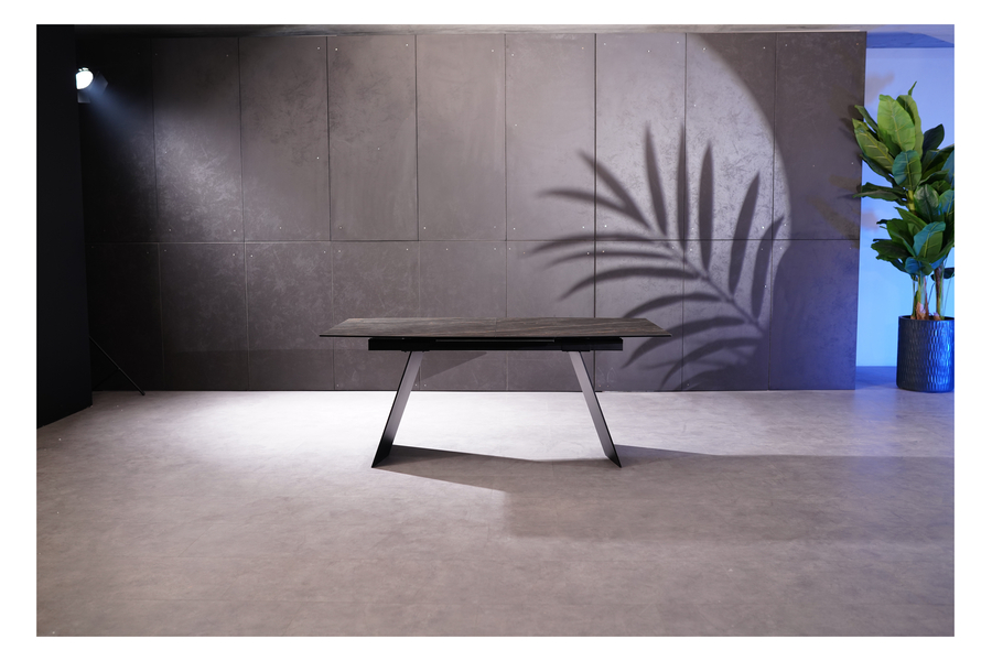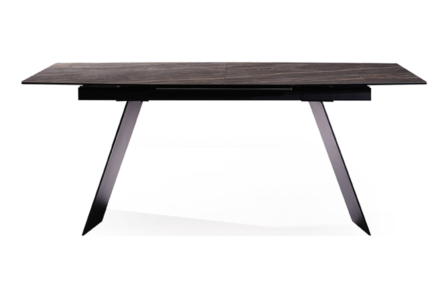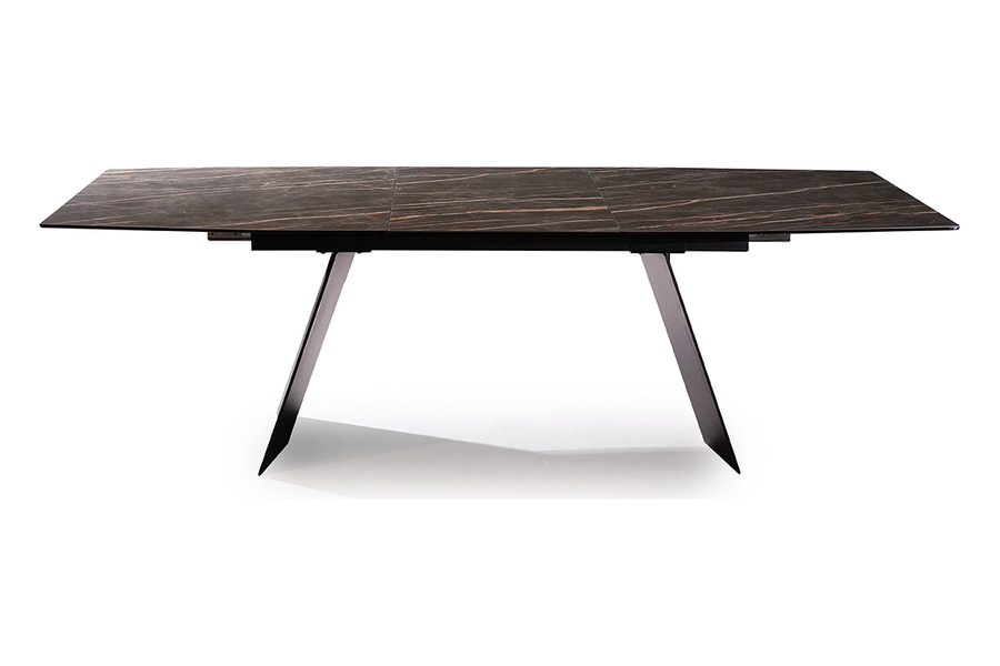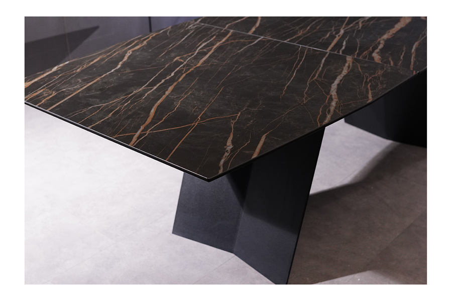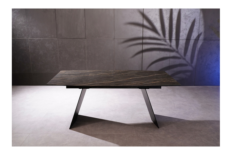 Η μεταλλική βάση σε ιδιαίτερο γλυπτό σχήμα προσδίδει σταθερότητα και αρχιτεκτονικό χαρακτήρα, ενώ ο μηχανισμός προέκτασης επιτρέπει την εύκολη επέκταση της επιφάνειας, εξασφαλίζοντας ευελιξία και άνεση για περισσότερους καλεσμένους.