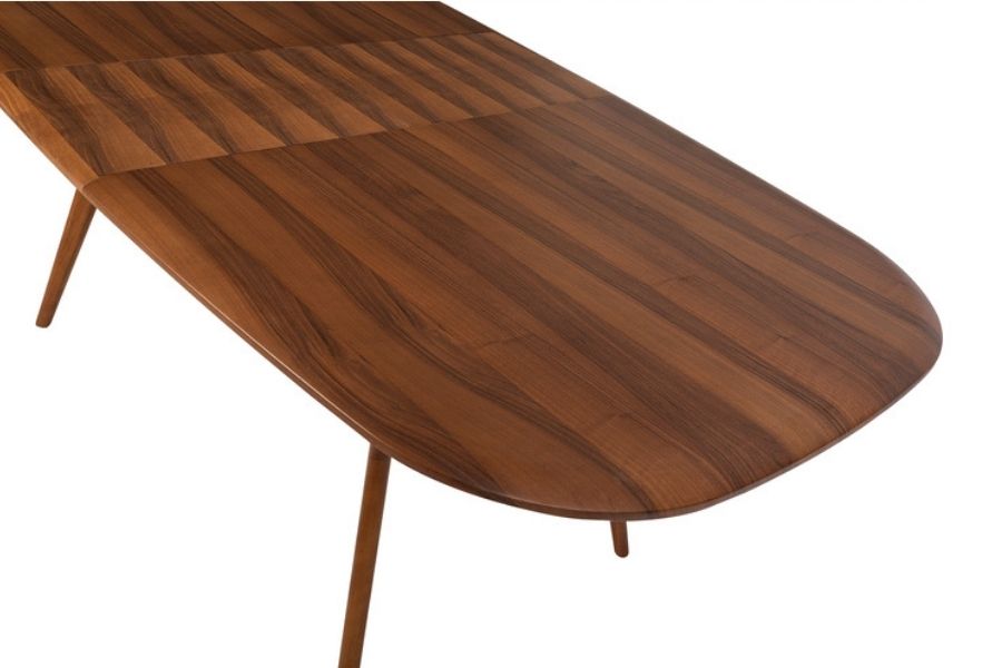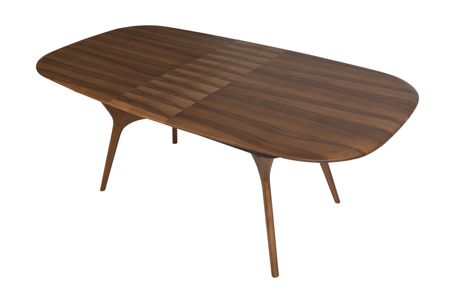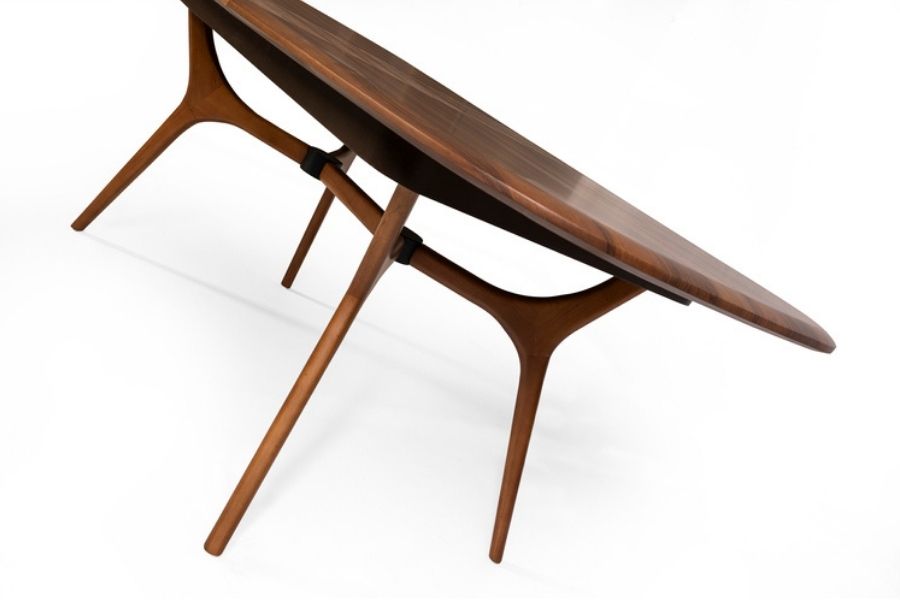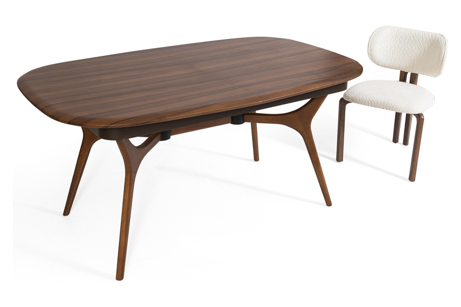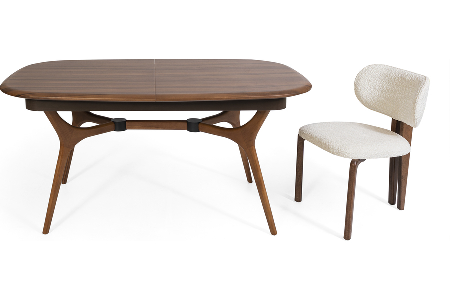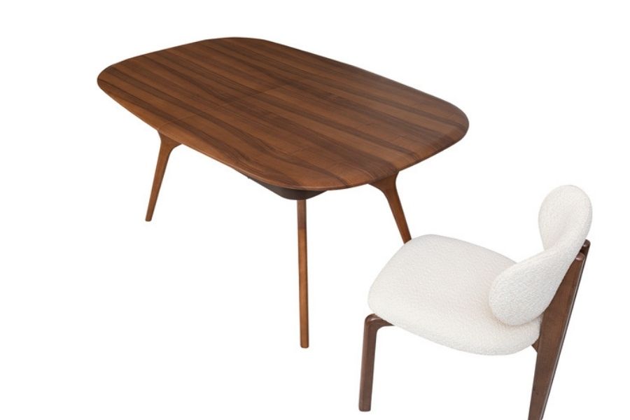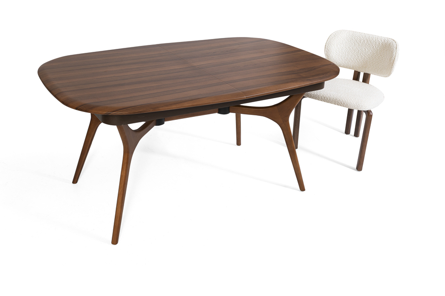 Η οργανική, καμπύλη φόρμα της επιφάνειας σε συνδυασμό με τη γλυπτική ξύλινη βάση δημιουργούν ένα αρμονικό και ισορροπημένο αποτέλεσμα. Ο μηχανισμός επέκτασης (όπου υπάρχει) ενσωματώνεται διακριτικά, διατηρώντας την καθαρότητα του σχεδιασμού.