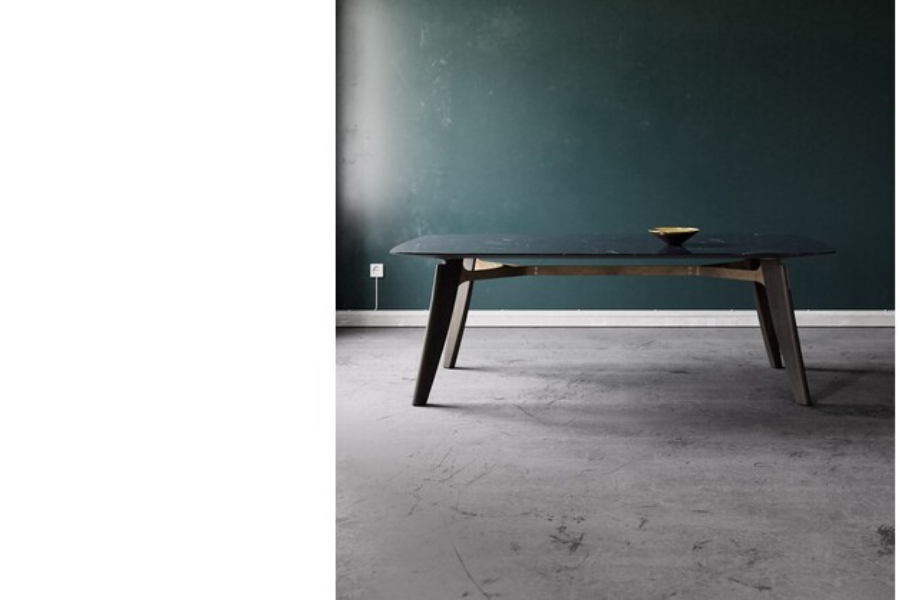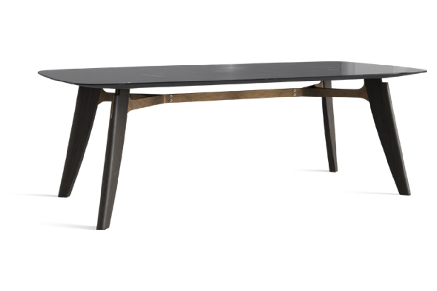 Τα ελαφρώς κεκλιμένα πόδια από ξύλο προσφέρουν φυσικότητα και ζεστασιά, ενώ η μεταλλική ενίσχυση στο κάτω μέρος προσθέτει μια διακριτική industrial πινελιά και ενισχύει τη δομική ακεραιότητα του τραπεζιού. Ο συνδυασμός αυτός δημιουργεί ένα σύγχρονο contrast που ταιριάζει ιδανικά σε modern και contemporary χώρους.