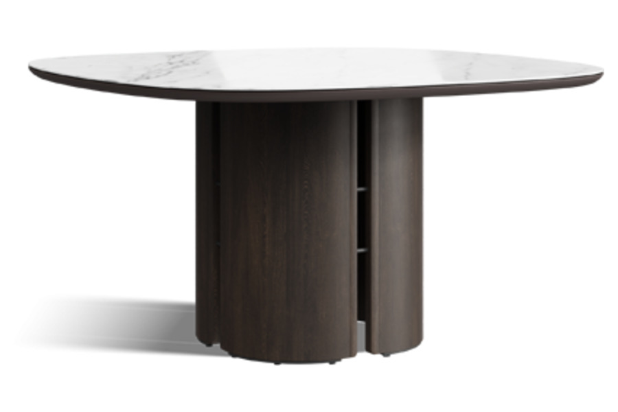 Η εντυπωσιακή βάση από σκούρο wood finish, με κυλινδρικά και καμπύλα στοιχεία, δημιουργεί μία ισχυρή γλυπτική παρουσία. Ο κεντρικός σχεδιασμός της βάσης επιτρέπει άνετη τοποθέτηση καθισμάτων περιμετρικά, ενισχύοντας τη λειτουργικότητα του τραπεζιού.