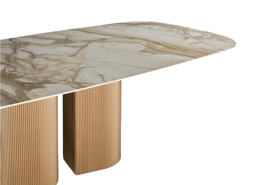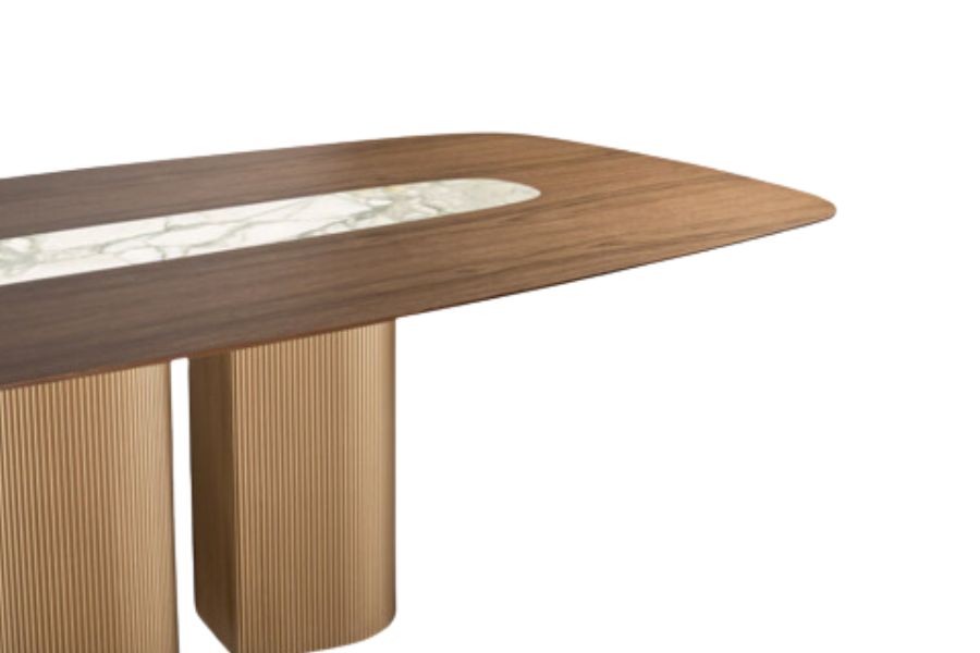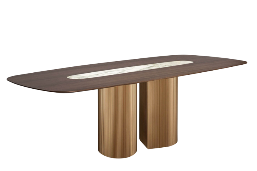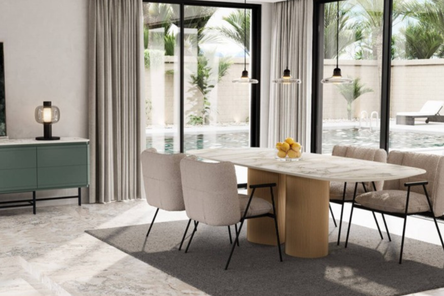 Το τραπέζι ενσωματώνεται ιδανικά σε μοντέρνα και κομψά περιβάλλοντα τραπεζαρίας, αποτελώντας το κεντρικό στοιχείο του χώρου.