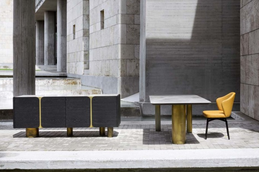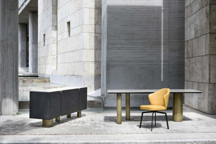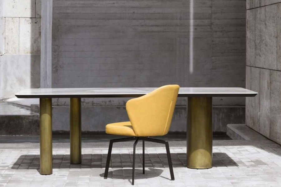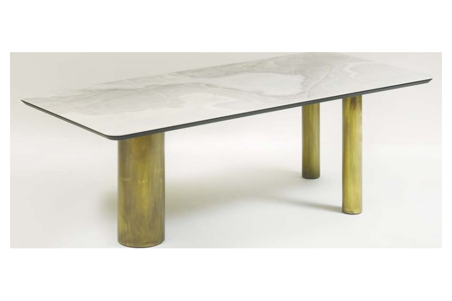 Η χαρακτηριστική βάση με κυλινδρικά μεταλλικά πόδια σε warm μεταλλικό τόνο δημιουργεί ένα ισχυρό αρχιτεκτονικό αποτύπωμα, προσδίδοντας στο τραπέζι μοναδικό χαρακτήρα. Ο συνδυασμός υλικών ενισχύει την premium αίσθηση και καθιστά το τραπέζι ιδανικό για χώρους με design ταυτότητα.