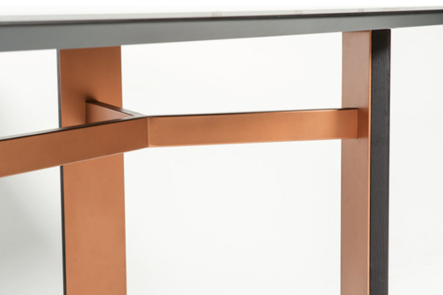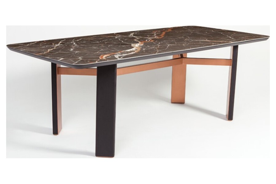 Η επιφάνεια διαθέτει marble-effect φινίρισμα σε σκούρους τόνους, προσφέροντας μία πολυτελή όψη και υψηλή αισθητική. Οι φυσικές νευρώσεις ενισχύουν τον χαρακτήρα του τραπεζιού και προσδίδουν μοναδικότητα στο κάθε κομμάτι.