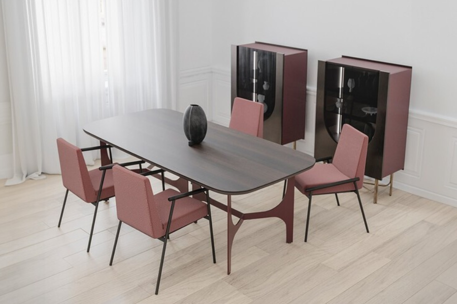 Ο συνδυασμός φυσικού ξύλου και βαμμένου μετάλλου δημιουργεί ένα σύγχρονο contrast, ιδανικό για modern και contemporary interiors. Η σχεδίαση επιτρέπει άνετη τοποθέτηση καθισμάτων, καθιστώντας το ιδανικό τόσο για καθημερινή χρήση όσο και για πιο formal dining καταστάσεις.