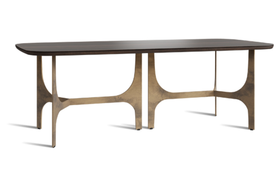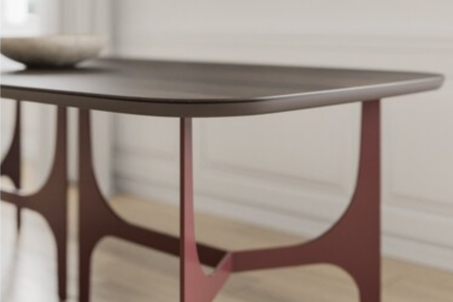 Η βάση του τραπεζιού είναι το βασικό στοιχείο ταυτότητας, με καμπύλες και κοψίματα που προσδίδουν ελαφρότητα παρά τη στιβαρή κατασκευή. Διατίθεται σε διαφορετικές αποχρώσεις μετάλλου, προσφέροντας ευελιξία και δυνατότητα προσαρμογής σε διαφορετικά στυλ χώρων.