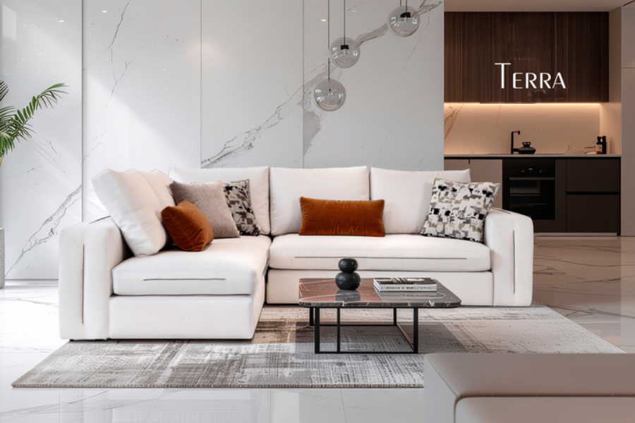 Τα μεγάλα, αναπαυτικά καθίσματα και οι πλούσιες πλάτες προσφέρουν ιδανική στήριξη, καθιστώντας τον Terra ιδανικό τόσο για χαλάρωση όσο και για στιγμές με οικογένεια και φίλους. Τα διακοσμητικά μαξιλάρια προσθέτουν ζεστασιά και στυλ, ενώ η γωνιακή διάταξη αξιοποιεί έξυπνα τον χώρο, δημιουργώντας ένα ολοκληρωμένο σημείο συνάντησης στο καθιστικό. Γωνιακός καναπές Terra σε μοντέρνο ύφος. Ο καναπές διατίθεται με δυνατότητα επιλογής δεξιάς ή αριστερής γωνίας, ώστε να προσαρμόζεται ιδανικά στη διαρρύθμιση του χώρου σας.