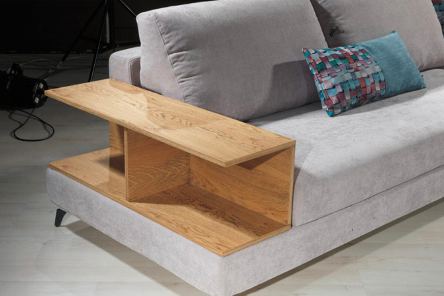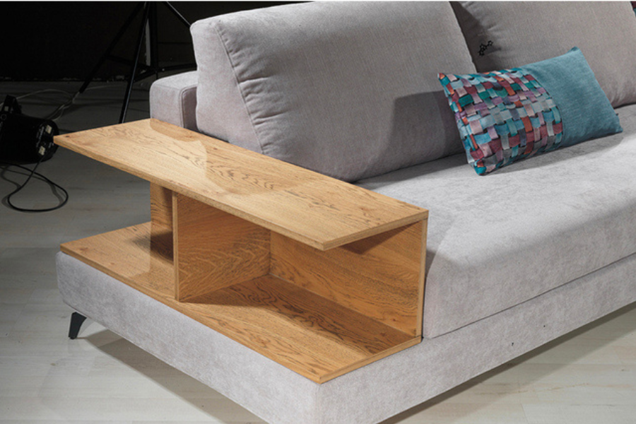 Ξεχωριστό χαρακτηριστικό του αποτελεί η ενσωματωμένη ξύλινη επιφάνεια στο πλάι, η οποία λειτουργεί ως πρακτικό βοηθητικό τραπέζι. Ιδανική για τοποθέτηση αντικειμένων καθημερινής χρήσης, ενισχύει τη λειτουργικότητα του καναπέ χωρίς να αλλοιώνει τον minimal χαρακτήρα του.