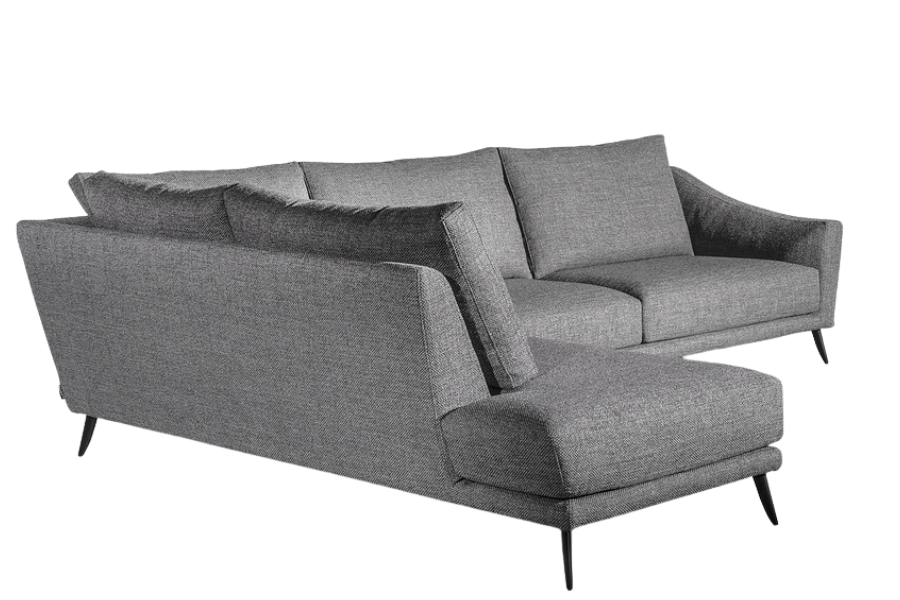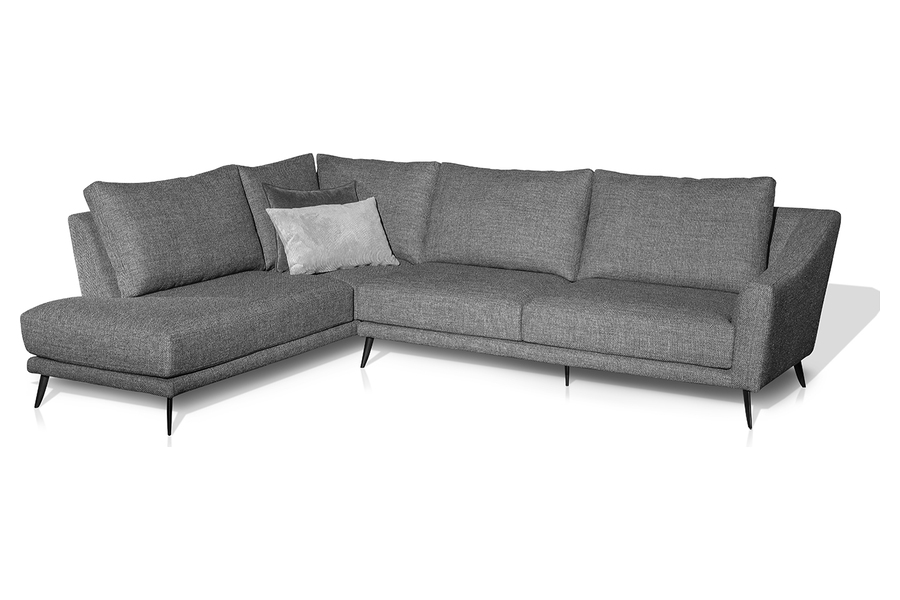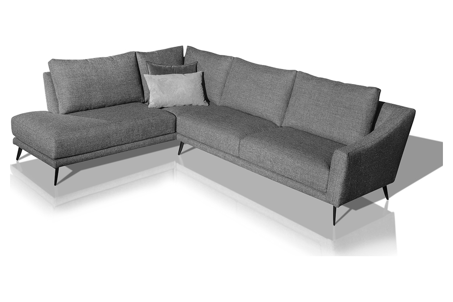 Η γωνιακή του διάταξη αξιοποιεί αποτελεσματικά τον χώρο, ενώ τα λεπτά μεταλλικά πόδια ενισχύουν τη σύγχρονη αισθητική και προσδίδουν ελαφρότητα στο σύνολο.