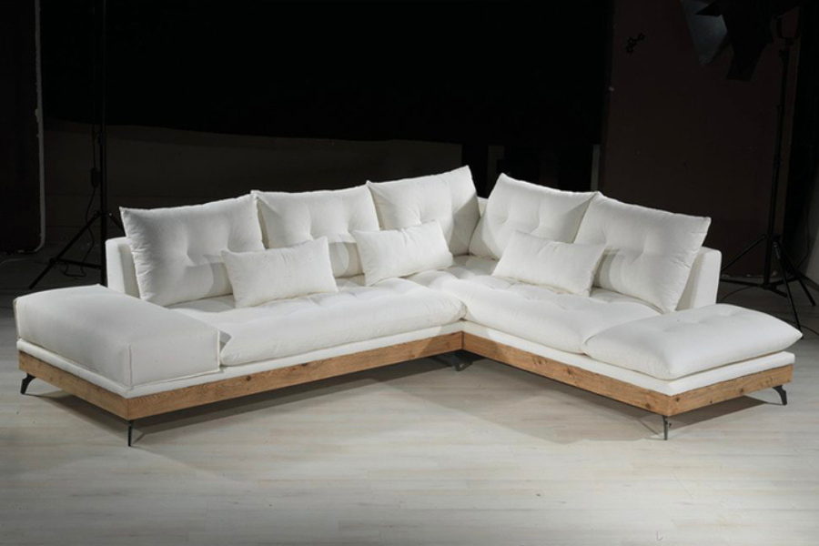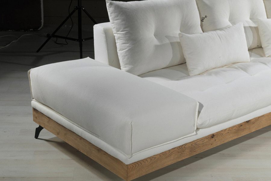 Η κατασκευή του συνδυάζει ποιοτικά υλικά με έμφαση στη λεπτομέρεια. Η υφασμάτινη επένδυση σε ανοιχτόχρωμη απόχρωση χαρίζει φωτεινότητα στον χώρο, ενώ τα πλούσια, αφράτα μαξιλάρια εξασφαλίζουν ξεκούραστο κάθισμα και στήριξη.