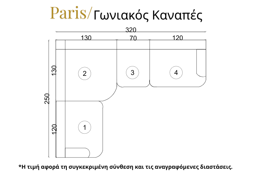 Η τιμή αφορά σύνθεση γωνιακού καναπέ διαστάσεων 320 × 250 cm και περιλαμβάνει τα παρακάτω τμήματα (όπως απεικονίζονται στο σχέδιο):