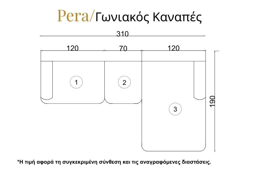 Η τιμή αφορά σύνθεση γωνιακού καναπέ διαστάσεων 310 × 190 cm και περιλαμβάνει τα παρακάτω τμήματα (όπως απεικονίζονται στο σχέδιο):