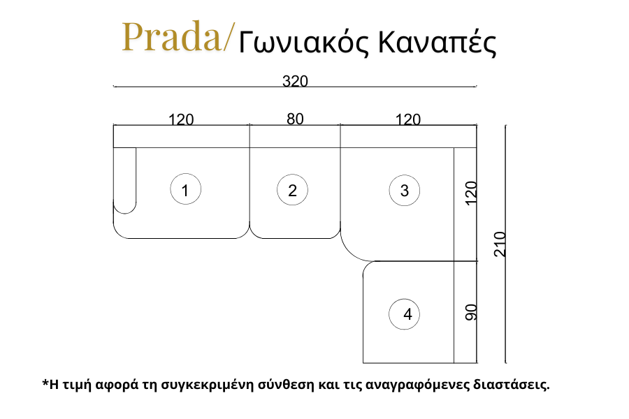 Η τιμή αφορά σύνθεση γωνιακού καναπέ διαστάσεων 320 × 210 cm και περιλαμβάνει τα παρακάτω τμήματα (όπως απεικονίζονται στο σχέδιο):