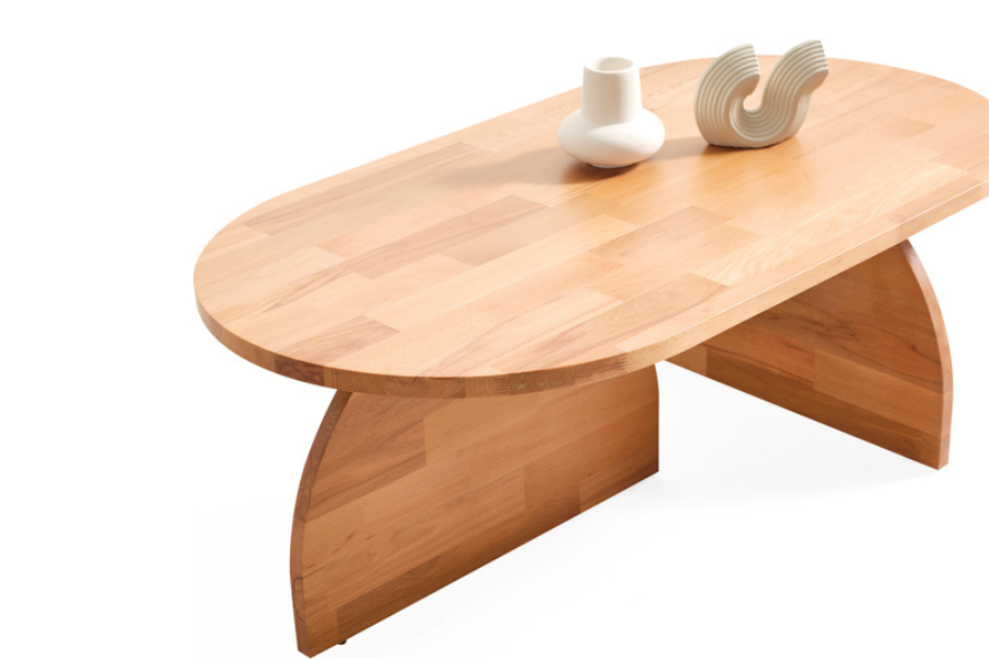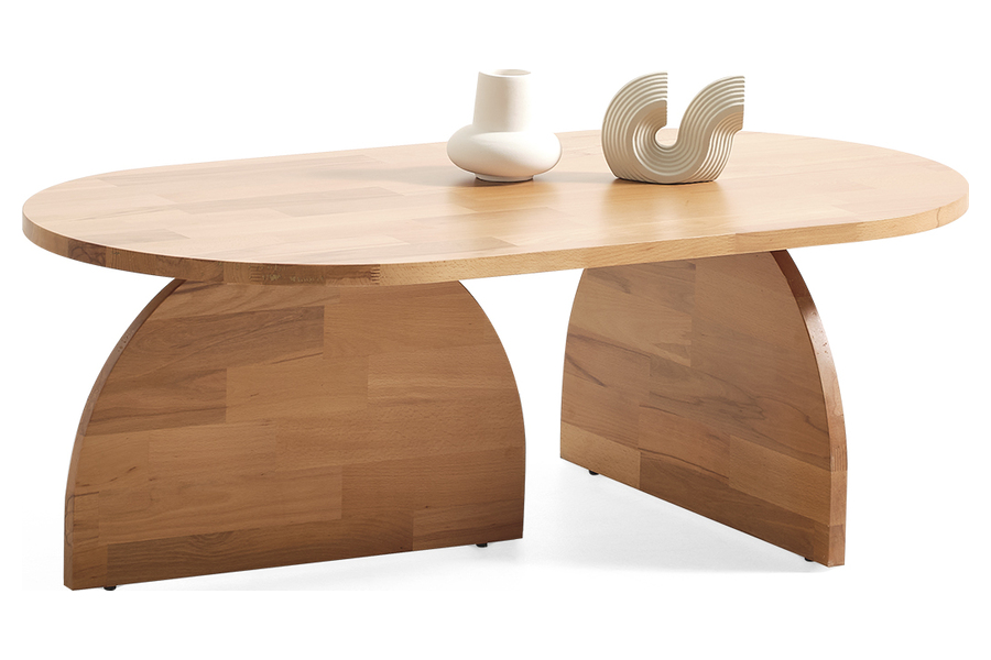 Η οβάλ επιφάνεια με απαλή καμπυλότητα δημιουργεί ένα φιλικό και αρμονικό αποτέλεσμα, ενώ οι καμπύλες ξύλινες βάσεις προσδίδουν μοναδική αρχιτεκτονική ταυτότητα στο έπιπλο.