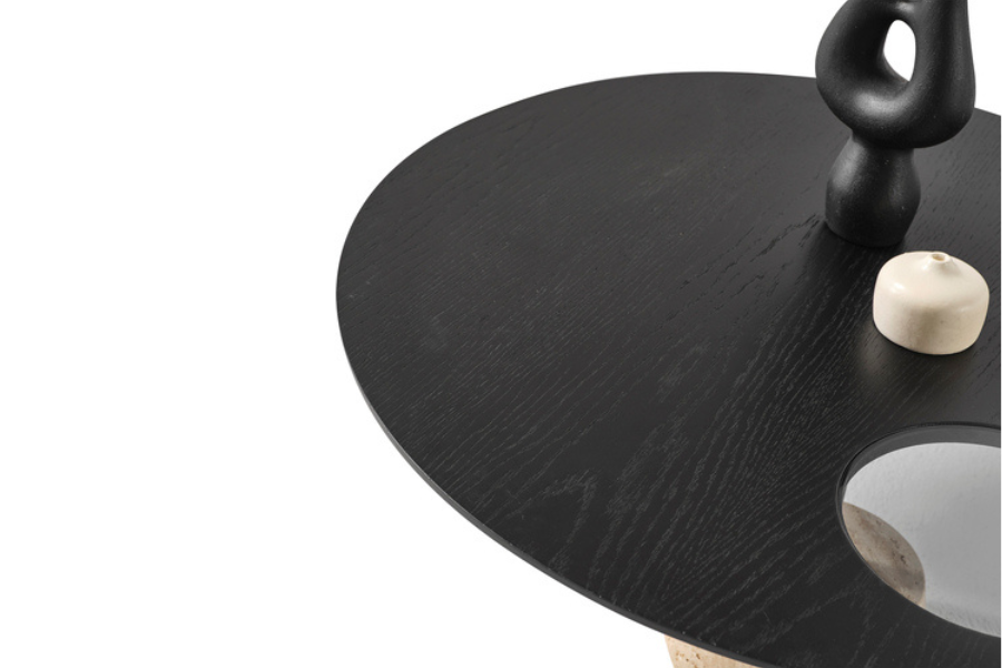 Η μαύρη ξύλινη επιφάνεια με εμφανή νερά προσδίδει κομψότητα και βάθος, ενώ η ενσωματωμένη γυάλινη λεπτομέρεια δημιουργεί ένα μοναδικό οπτικό παιχνίδι φωτός.