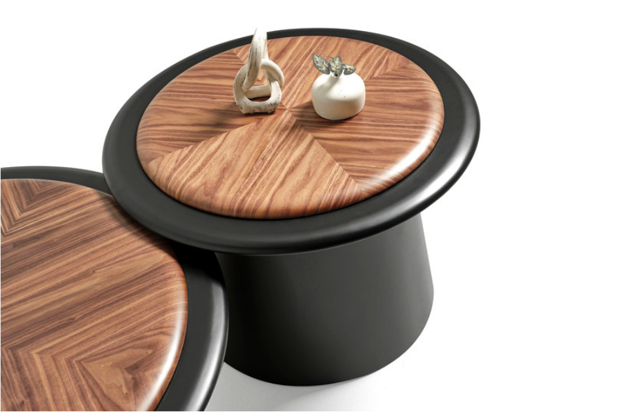 Η στρογγυλή επιφάνεια με γεωμετρική όψη ξύλου σε συνδυασμό με τη μαύρη λεπτομέρεια περιμετρικά δημιουργεί έντονη σχεδιαστική αντίθεση, προσδίδοντας χαρακτήρα και μοντέρνο ύφος στο σαλόνι. Η στιβαρή κατασκευή εξασφαλίζει σταθερότητα και αντοχή στην καθημερινή χρήση.