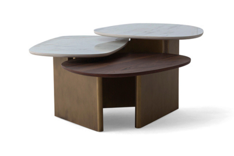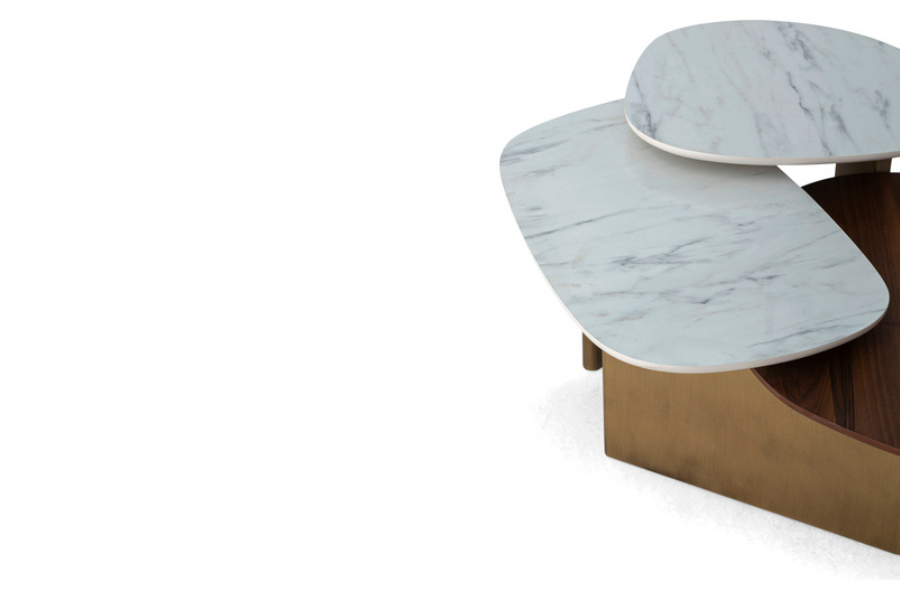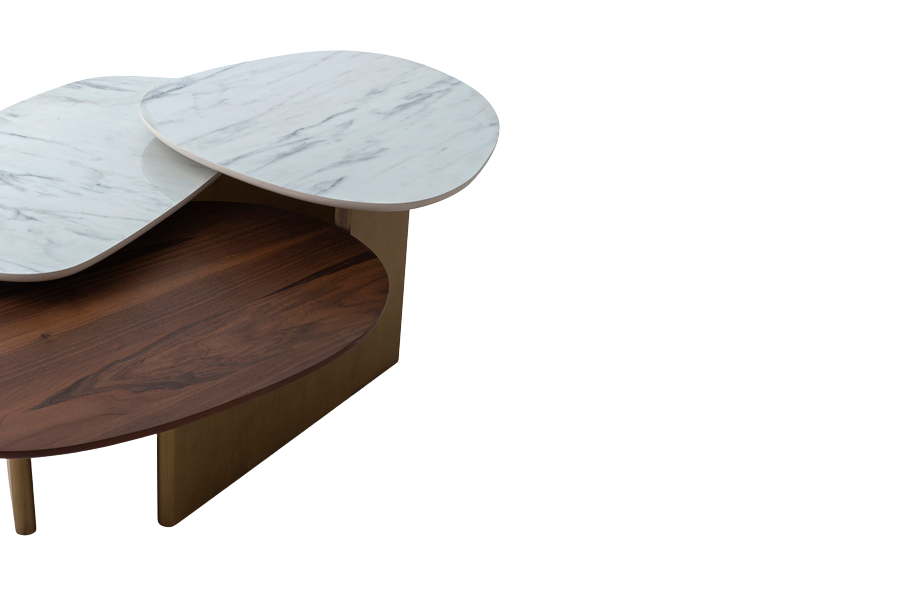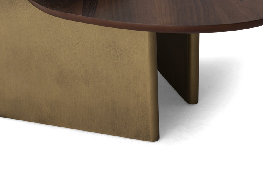Η κατασκευή του συνδυάζει την αριστοκρατική αίσθηση του λευκού μαρμάρου με τη φυσική ζεστασιά του ξύλου καρυδιάς. Οι οργανικές, ελλειπτικές επιφάνειες εδράζονται πάνω σε μια στιβαρή μεταλλική βάση με μπρονζέ αντικέ φινίρισμα, προσφέροντας μια πολυτελή αντίθεση που ταιριάζει σε κάθε contemporary καθιστικό. Κάθε υλικό έχει επιλεγεί για την αντοχή του και την ικανότητά του να προσδίδει χαρακτήρα στον χώρο.