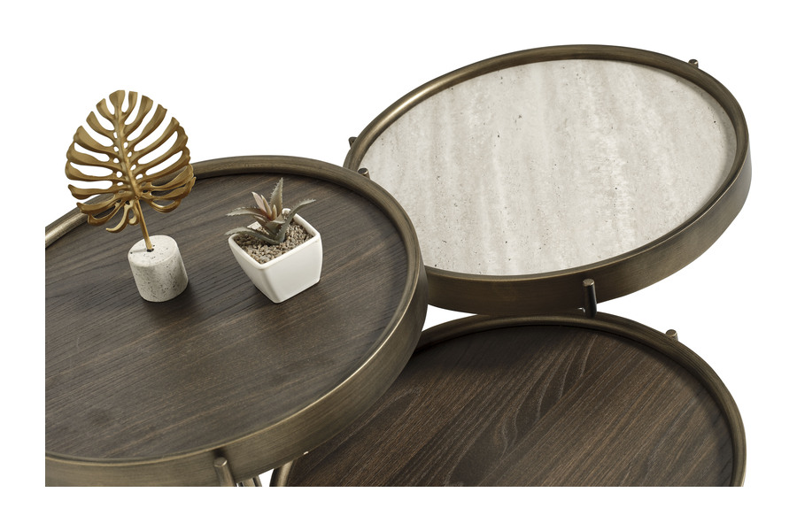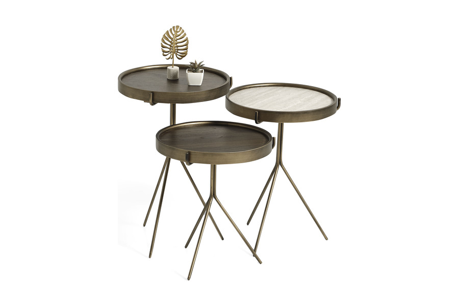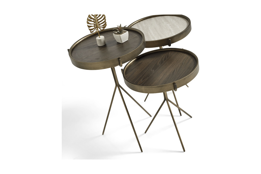 Η κυκλική τους μορφή και τα λεπτά μεταλλικά πόδια προσδίδουν ελαφρότητα στον χώρο, ενώ η δυνατότητα τοποθέτησής τους μαζί ή ξεχωριστά προσφέρει ευελιξία στη διακόσμηση.