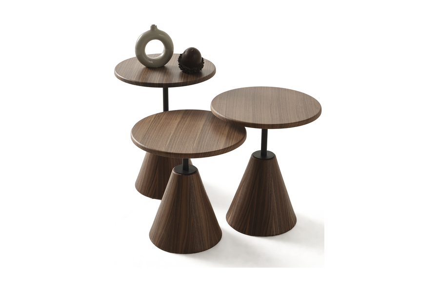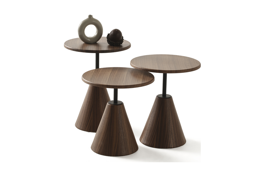 Οι στρογγυλές επιφάνειες με όψη καρυδιάς προσδίδουν ζεστασιά στον χώρο, ενώ η μεταλλική βάση εξασφαλίζει σταθερότητα και αντοχή. Το διαφορετικό ύψος των τραπεζιών προσφέρει ευελιξία στη χρήση και επιτρέπει πολλαπλές συνθέσεις στον χώρο.