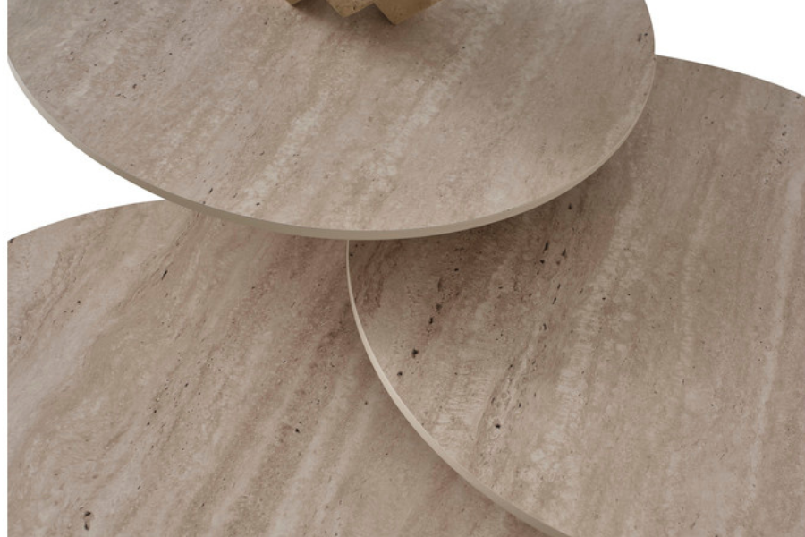 Το σετ βοηθητικών τραπεζιών σαλονιού Travertine Νο 596 αποτελεί μια ιδιαίτερα εκλεπτυσμένη πρόταση για σύγχρονους χώρους. Οι στρογγυλές επιφάνειες με όψη φυσικής πέτρας travertine προσδίδουν διαχρονική αισθητική και φυσική κομψότητα, ενώ η μεταλλική βάση σε ζεστή απόχρωση δημιουργεί αίσθηση πολυτέλειας και σταθερότητας.