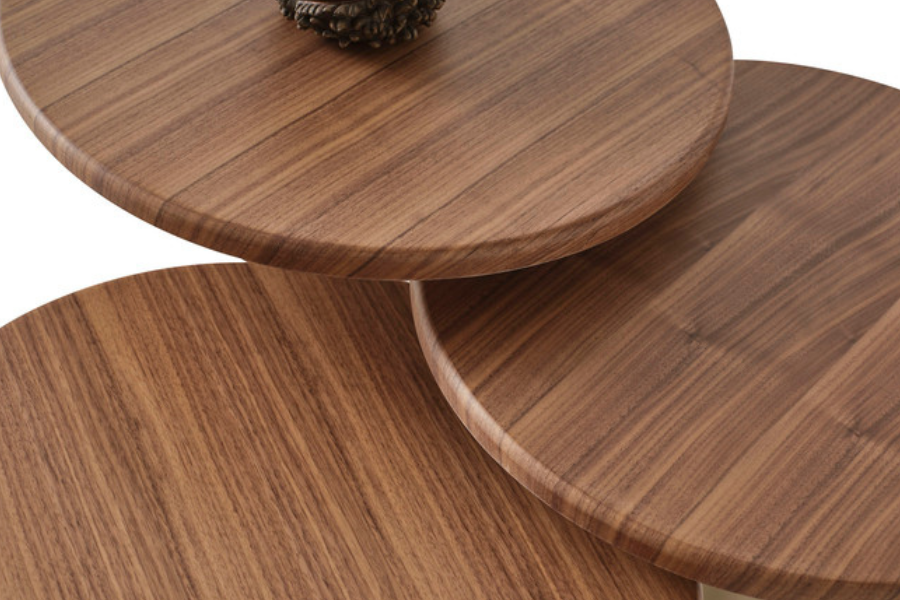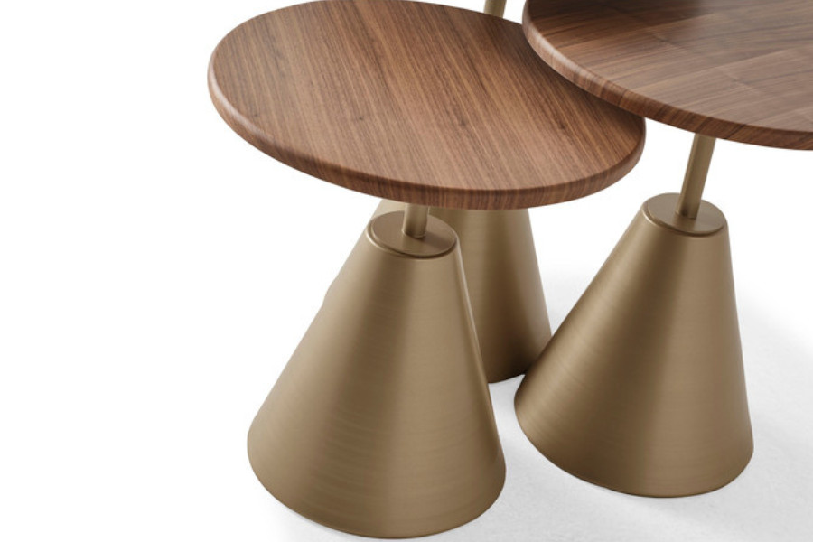 Οι στρογγυλές επιφάνειες σε απόχρωση καρυδιάς (walnut) προσφέρουν ζεστασιά και διαχρονικό χαρακτήρα, ενώ οι μεταλλικές βάσεις σε κομψό χρυσό τόνο προσθέτουν πολυτέλεια και σταθερότητα.