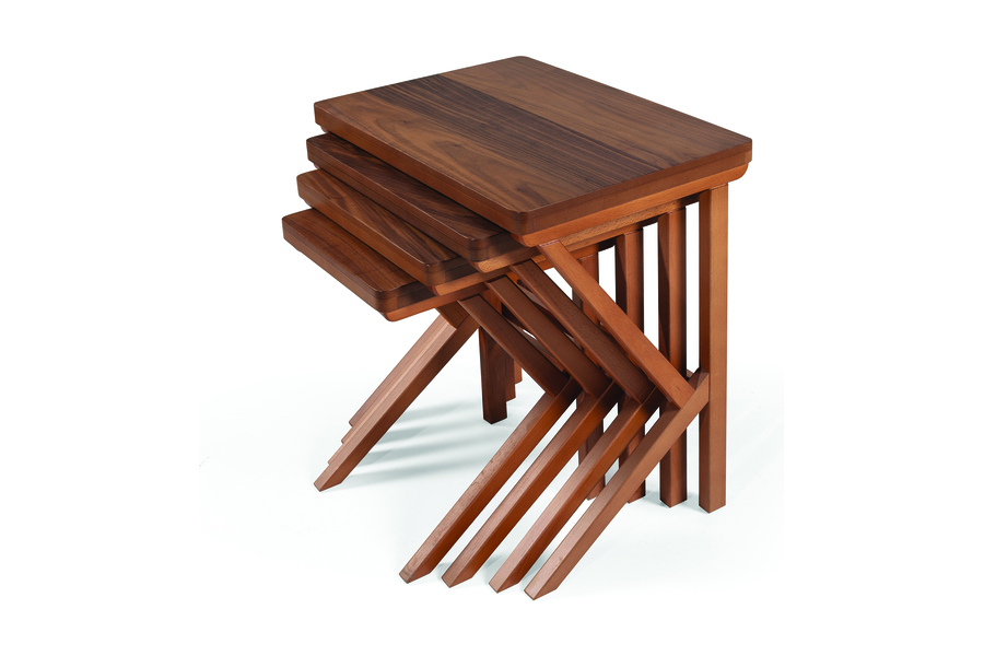 Το σετ βοηθητικών τραπεζιών σαλονιού No 509 αποτελείται από πολλαπλά ξύλινα τραπεζάκια με πτυσσόμενο μηχανισμό, προσφέροντας ευελιξία και εργονομία στον χώρο.