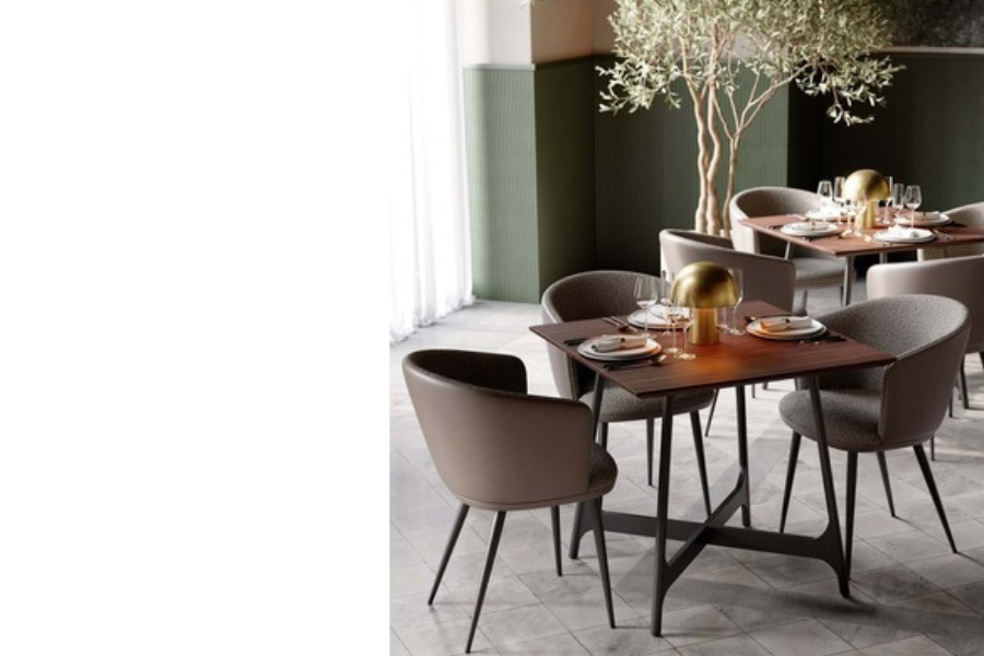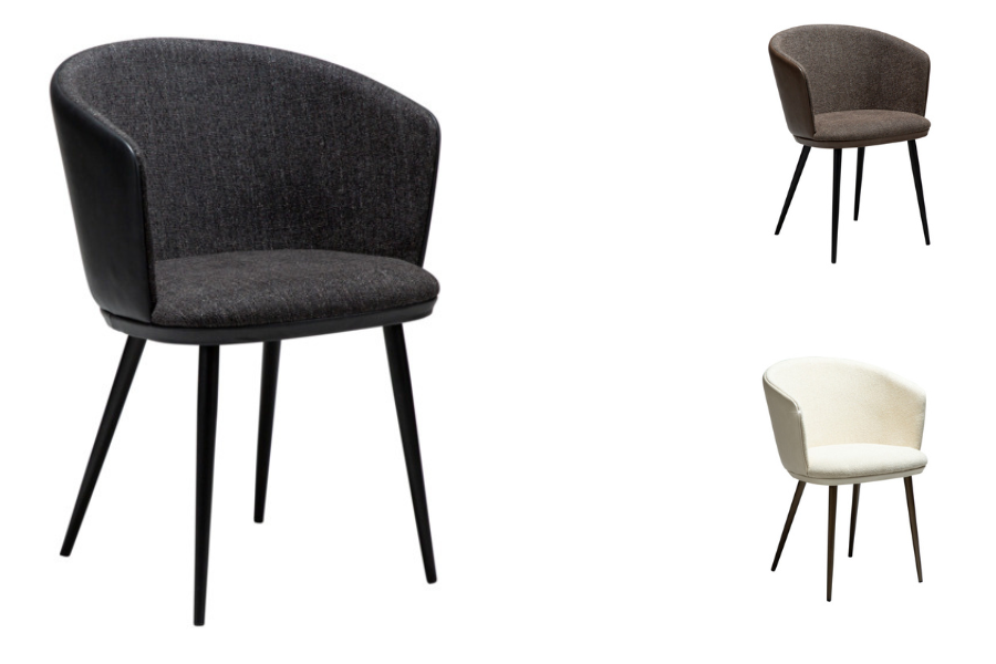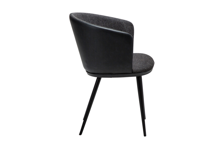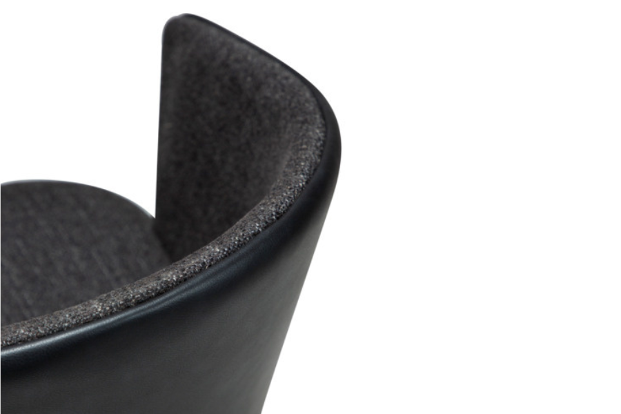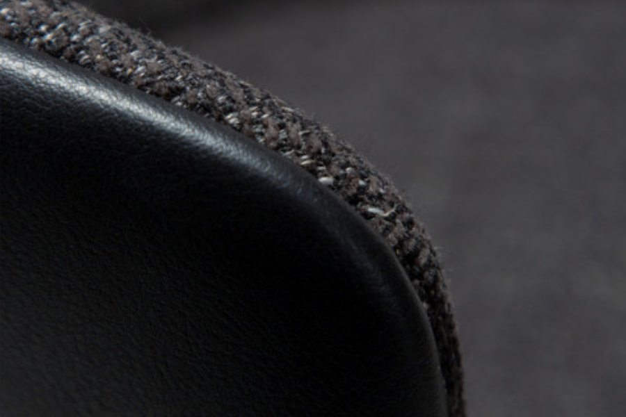 Ο σχεδιασμός της περιλαμβάνει αγκαλιαστή πλάτη με ενσωματωμένα μπράτσα, προσφέροντας εργονομική στήριξη και αίσθηση χαλάρωσης. Το κάθισμα διαθέτει υφασμάτινη επένδυση υψηλής ποιότητας, ενώ το εξωτερικό της πλάτης σε όψη δέρματος προσθέτει contrast και μοντέρνο χαρακτήρα.