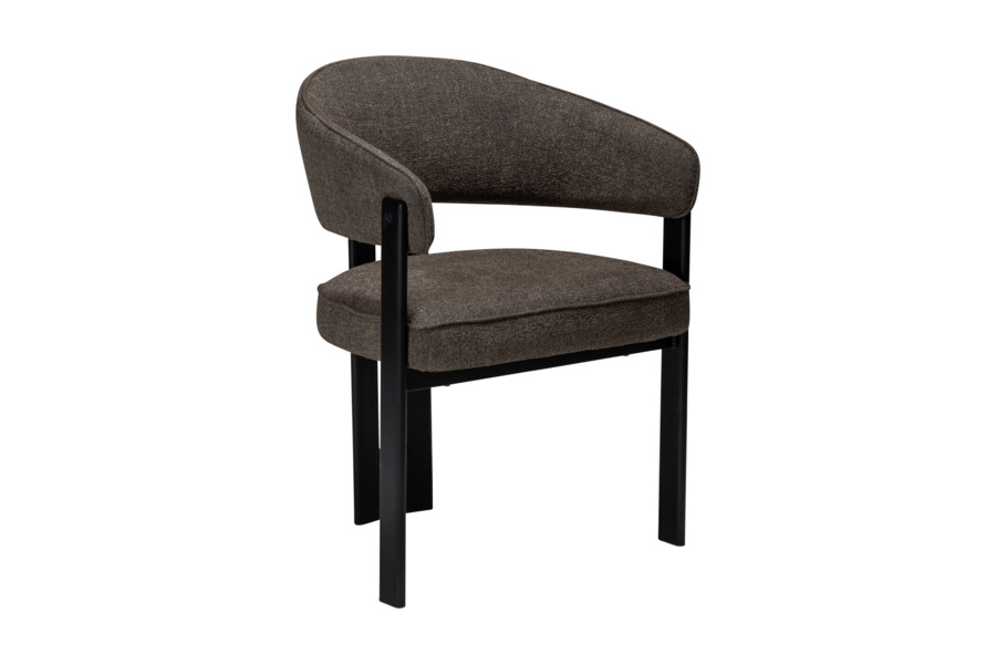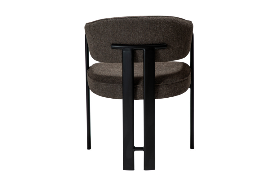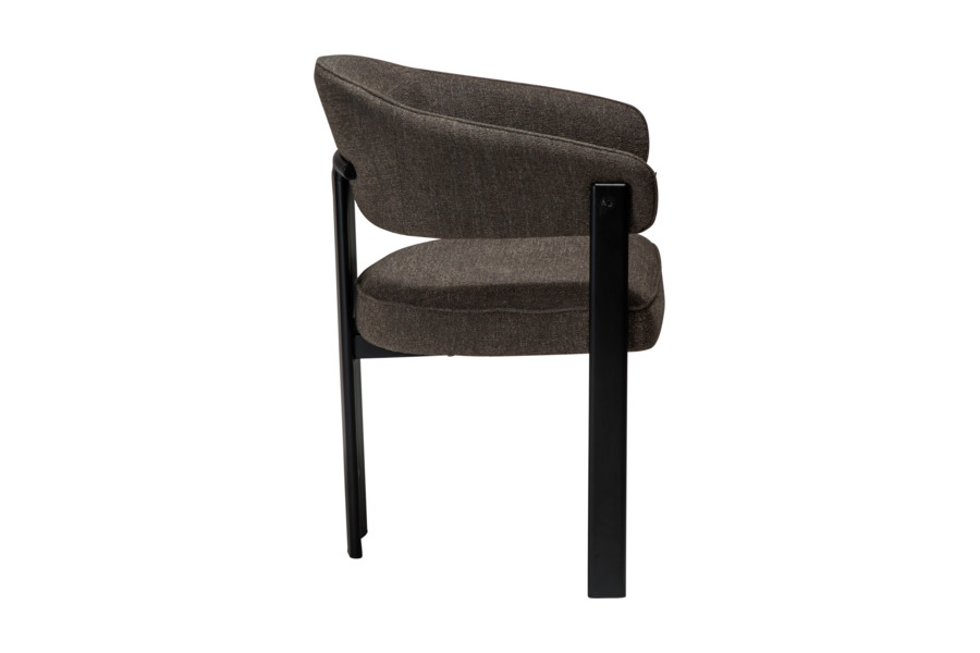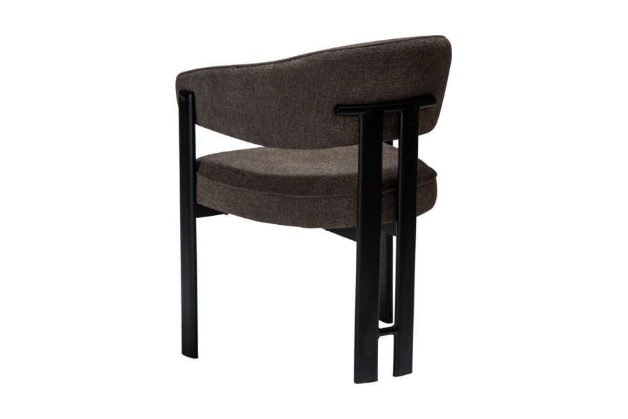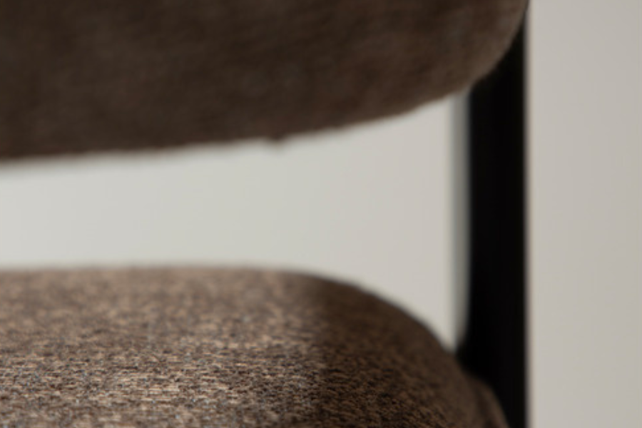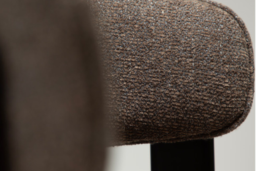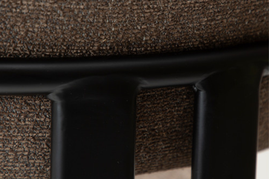 Η επένδυση από bouclé ύφασμα σε απόχρωση major brown προσδίδει ζεστασιά και βάθος, ενώ το πλούσιο κάθισμα ενισχύει την αίσθηση πολυτέλειας. Η μεταλλική βάση εξασφαλίζει σταθερότητα και αντοχή στη χρήση.