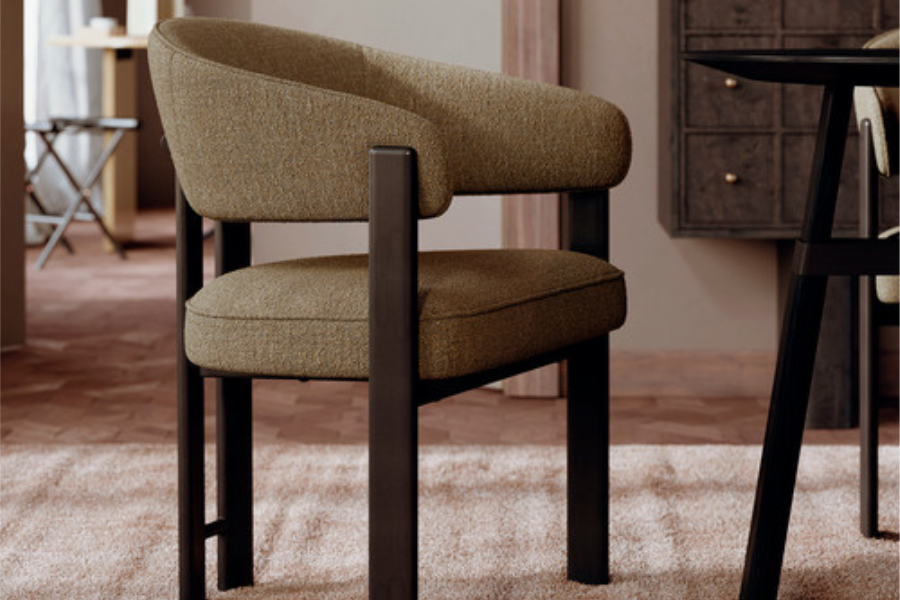 Ο σχεδιασμός της χαρακτηρίζεται από τα παράλληλα πίσω πόδια, τοποθετημένα σε κοντινή απόσταση, που δημιουργούν μια καθαρή αρχιτεκτονική γραμμή. Το ενιαίο, καμπύλο στήριγμα πλάτης που επεκτείνεται σε μπράτσα αγκαλιάζει το σώμα, προσφέροντας εξαιρετική εργονομία και άνεση.