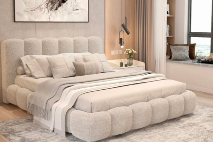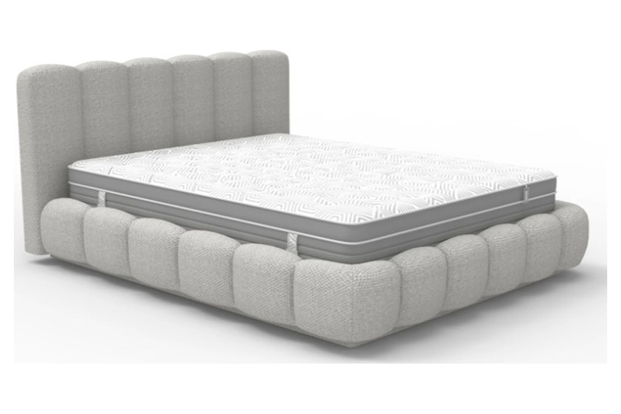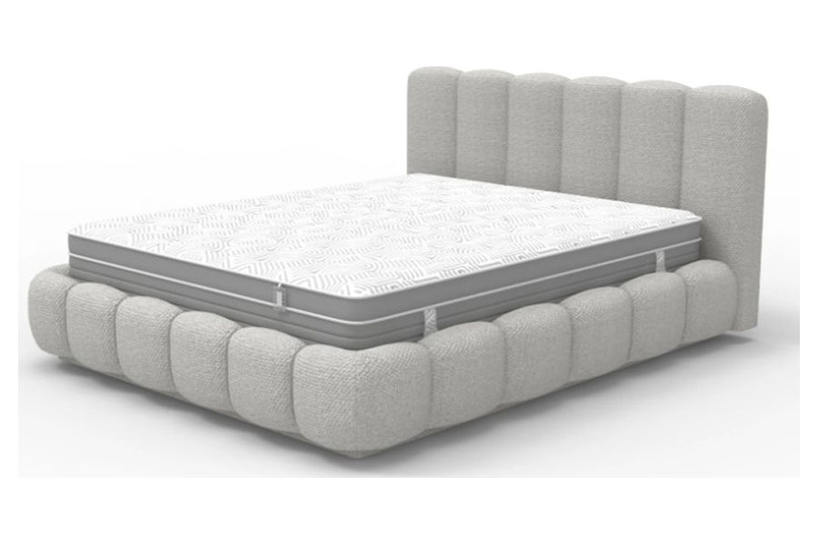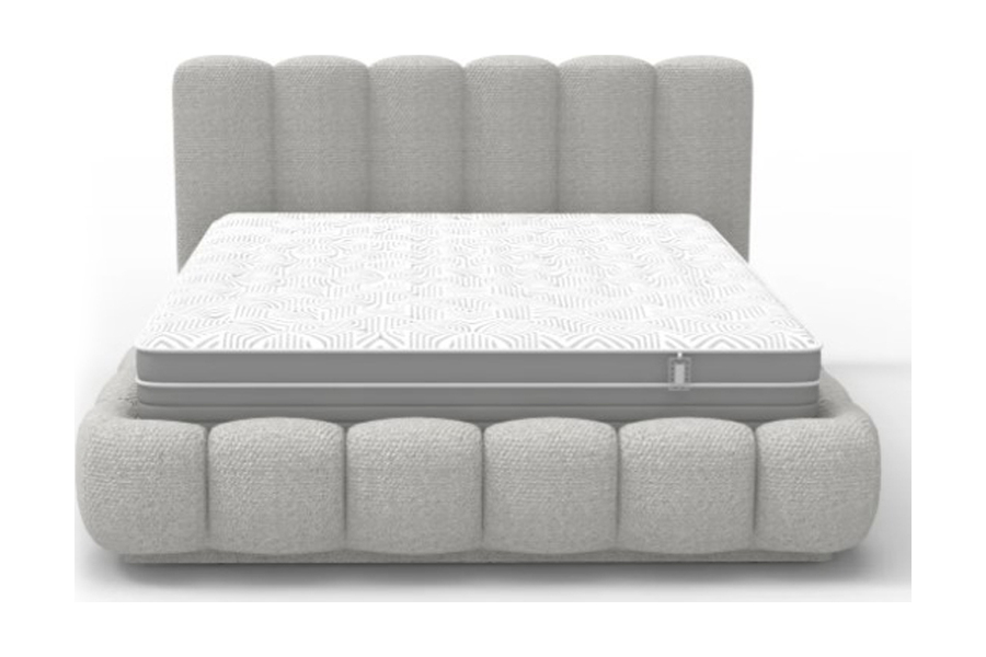 Η υφασμάτινη επένδυση υψηλής ποιότητας καλύπτει ολόκληρη την κατασκευή, προσφέροντας απαλή υφή και ζεστή αίσθηση. Το καπιτονέ κεφαλάρι με τις κάθετες καμπύλες γραμμές ενισχύει την άνεση και δημιουργεί ένα διακριτικό αλλά εντυπωσιακό αισθητικό αποτέλεσμα.