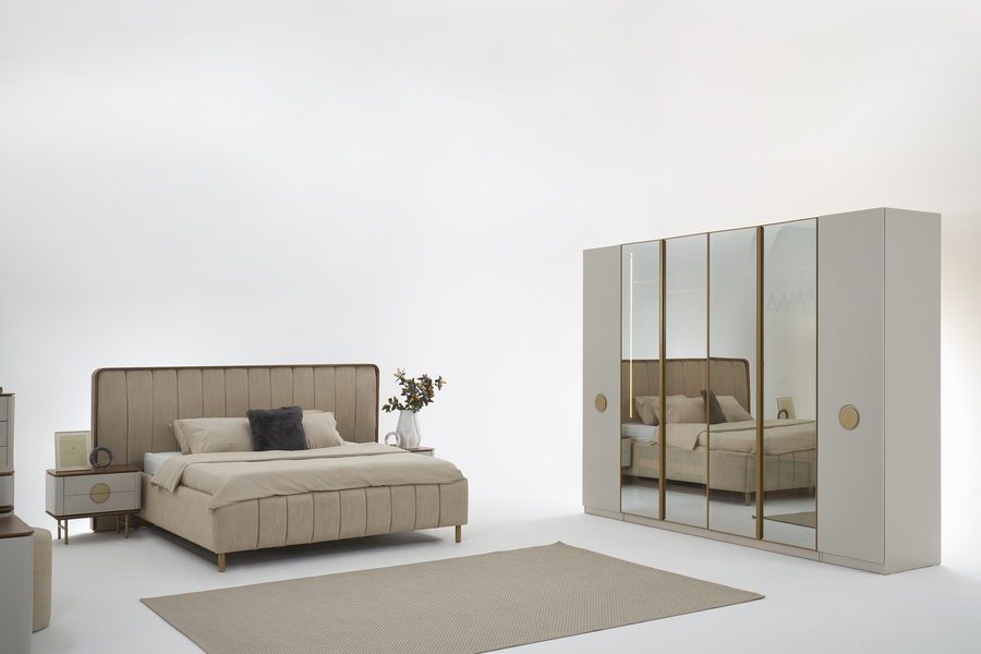 Το σετ κρεβατοκάμαρας Viola συνδυάζει κομψό σχεδιασμό με σύγχρονη λειτουργικότητα, δημιουργώντας ένα υπνοδωμάτιο που αποπνέει αρμονία και διακριτική πολυτέλεια. Οι απαλές αποχρώσεις, οι καθαρές γραμμές και οι χρυσές λεπτομέρειες συνθέτουν ένα σύνολο επίπλων που προσφέρει άνεση και αισθητική ισορροπία.