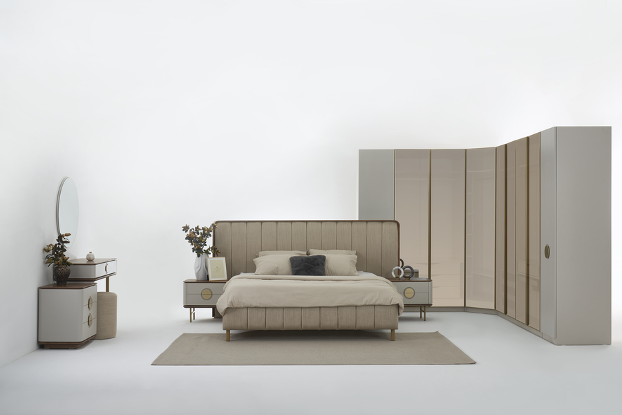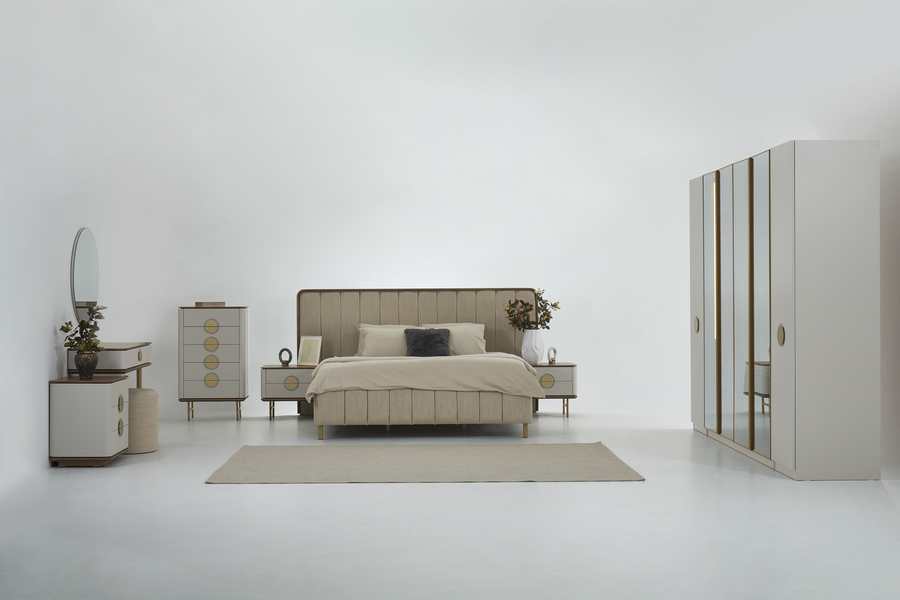 Η συρταριέρα με τον καθρέφτη προσφέρει πρακτικό χώρο για αποθήκευση ρούχων και προσωπικών αντικειμένων, ενώ ταυτόχρονα λειτουργεί ως ένα κομψό σημείο προετοιμασίας μέσα στο υπνοδωμάτιο. Ο σχεδιασμός της ακολουθεί τη γενική αισθητική του σετ με διακριτικές λεπτομέρειες που ενισχύουν τον σύγχρονο χαρακτήρα του χώρου.