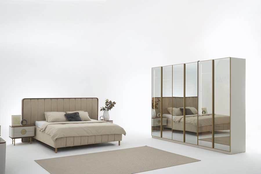Η ντουλάπα του σετ ολοκληρώνει τη σύνθεση με μοντέρνα αισθητική και ευρύχωρο εσωτερικό, προσφέροντας οργανωμένο χώρο αποθήκευσης για ρούχα και αξεσουάρ. Οι μεγάλες επιφάνειες και οι προσεγμένες λεπτομέρειες προσθέτουν κομψότητα και λειτουργικότητα στο υπνοδωμάτιο.