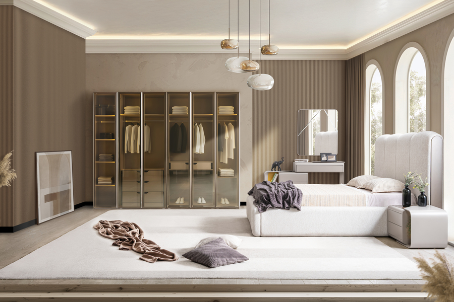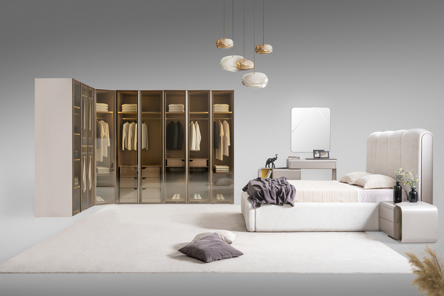Η ντουλάπα του σετ ξεχωρίζει για τον σύγχρονο σχεδιασμό της με μεγάλες γυάλινες επιφάνειες και οργανωμένο εσωτερικό χώρο. Προσφέρει άνετη αποθήκευση για ρούχα και αξεσουάρ, συμβάλλοντας στη δημιουργία ενός τακτοποιημένου και λειτουργικού υπνοδωματίου.