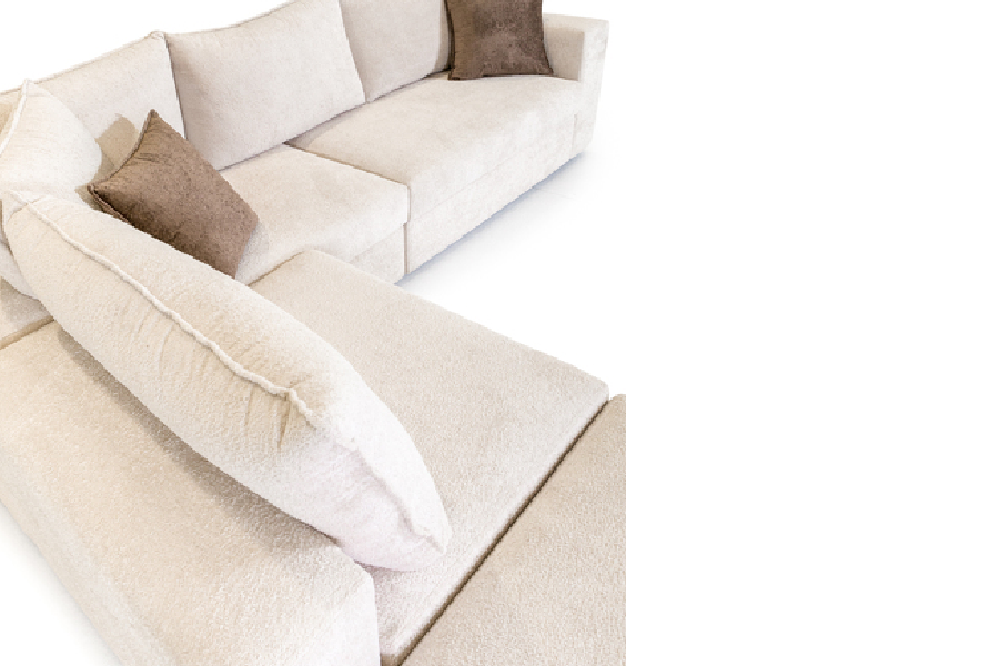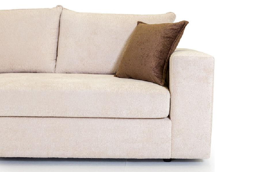 Η επένδυση από ύφασμα υψηλής ποιότητας προσφέρει απαλή υφή, ανθεκτικότητα στη χρήση και ευχάριστη αίσθηση στην καθημερινή επαφή. Τα μεγάλα, άνετα καθίσματα και τα αναπαυτικά μαξιλάρια πλάτης εξασφαλίζουν σωστή στήριξη και χαλάρωση, ενώ η ευρύχωρη γωνία προσφέρει επιπλέον επιφάνεια για ξεκούραση.