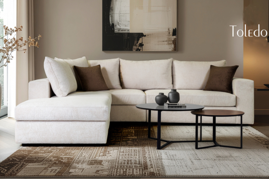 Ο γωνιακός καναπές Toledo συνδυάζει σύγχρονη αισθητική με απόλυτη άνεση, αποτελώντας ιδανική επιλογή για μοντέρνους και κομψούς χώρους σαλονιού. Ο καθαρός σχεδιασμός του, με γεωμετρικές γραμμές και ισορροπημένες αναλογίες, δημιουργεί μια διαχρονική εικόνα που ταιριάζει εύκολα σε κάθε διακόσμηση.