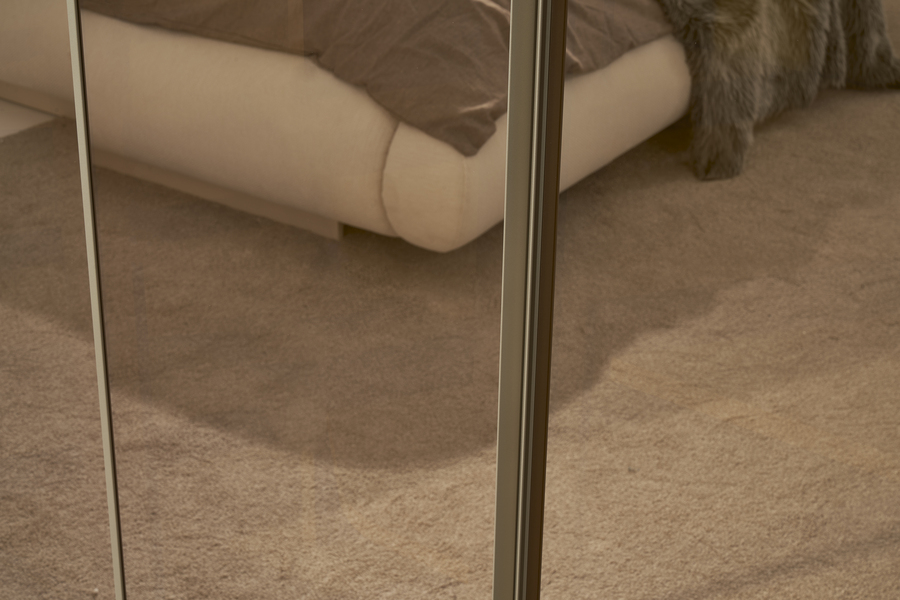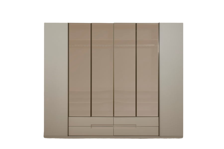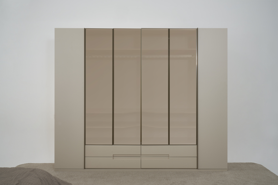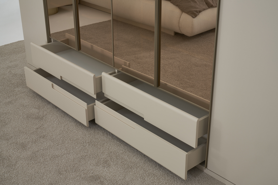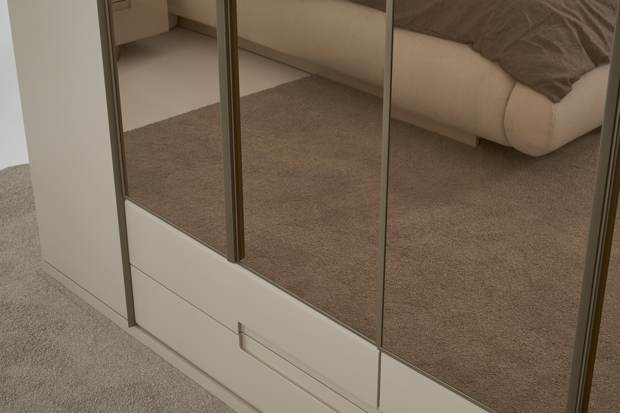 Οι πόρτες της ντουλάπας διαθέτουν σύγχρονο σχεδιασμό με μεγάλες επιφάνειες που ενισχύουν τη φωτεινότητα του χώρου, ενώ η στιβαρή κατασκευή εξασφαλίζει ανθεκτικότητα και μακροχρόνια χρήση.