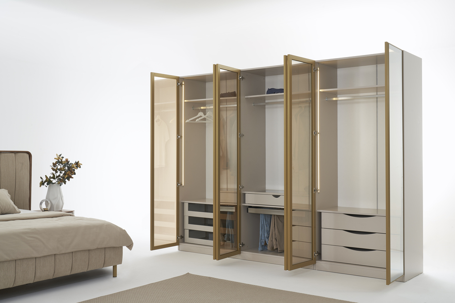 Το εσωτερικό της είναι οργανωμένο με ράφια, κρεμάστρες και συρτάρια, προσφέροντας άνετο και ευέλικτο αποθηκευτικό χώρο για ρούχα, αξεσουάρ και προσωπικά αντικείμενα.