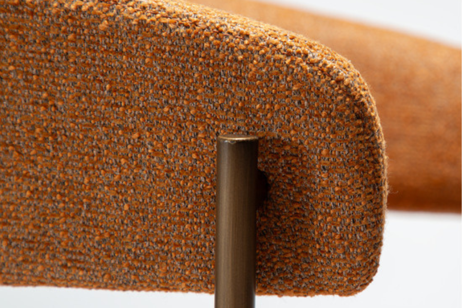 Η επένδυση από ύφασμα boucle σε απόχρωση beige προσδίδει φωτεινότητα και κομψότητα στον χώρο, ενώ η απαλή υφή ενισχύει την αίσθηση πολυτέλειας. Το εργονομικό κάθισμα ακολουθεί τις φυσικές γραμμές του σώματος, καθιστώντας την καρέκλα ιδανική τόσο για καθημερινή χρήση όσο και για πιο formal περιστάσεις.