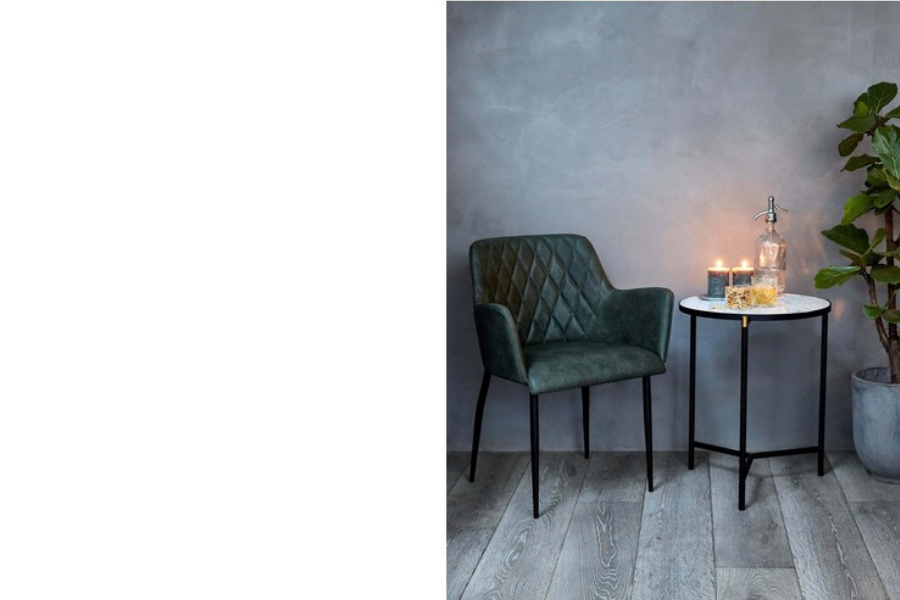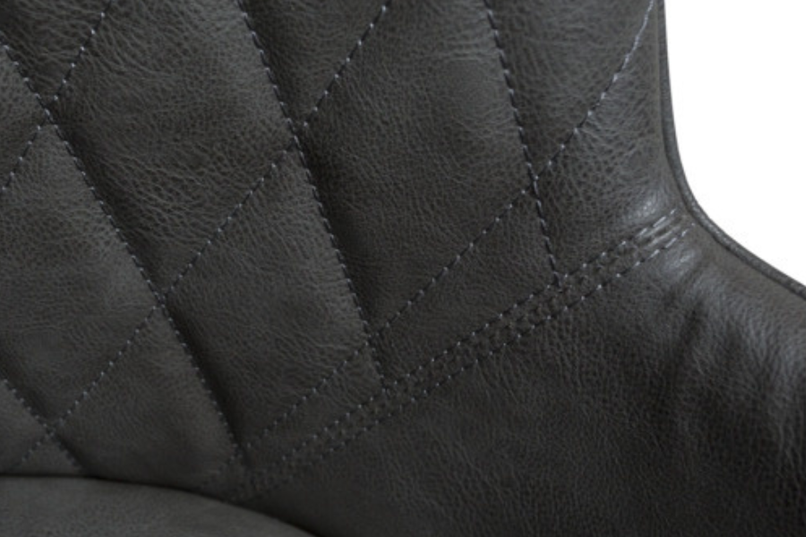 Η επένδυση από τεχνητό δέρμα σε απόχρωση  Grey προσφέρει την αίσθηση του αυθεντικού vintage δέρματος, ενώ παράλληλα είναι πρακτική και εύκολη στη συντήρηση. Το κάθισμα και τα μπράτσα είναι σχεδιασμένα ώστε να προσφέρουν άνεση και στήριξη, καθιστώντας την ιδανική για καθημερινή χρήση αλλά και για μεγαλύτερες συγκεντρώσεις.